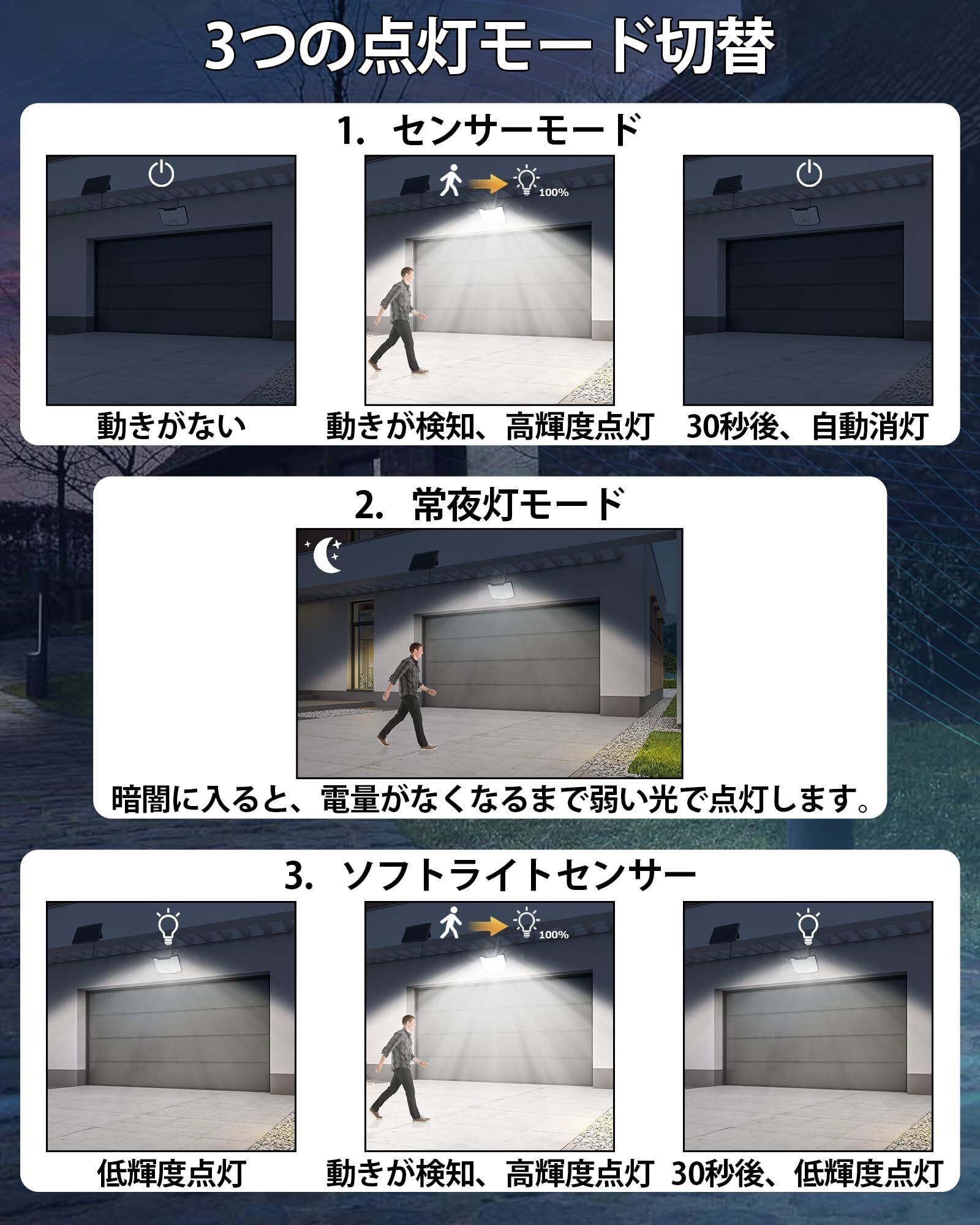 【3つの点灯モード・リモコン操作】弊社のソーラーライトは光センサーと人感センサーが搭載されています。リモコンのボタンを押すだけで3つのモードを設定できます。①センサーモード:闇になっても点灯なし。動きを感じされると強い光になり、30秒後、消灯状態になります。②常時点灯モード: 暗闇に入ると、電量がなくなるまで弱い光で点灯します。③DIMモード: 闇に入ると弱い光で点灯します。動きを感じされると強い光になり、30秒後、弱い光に戻ります。