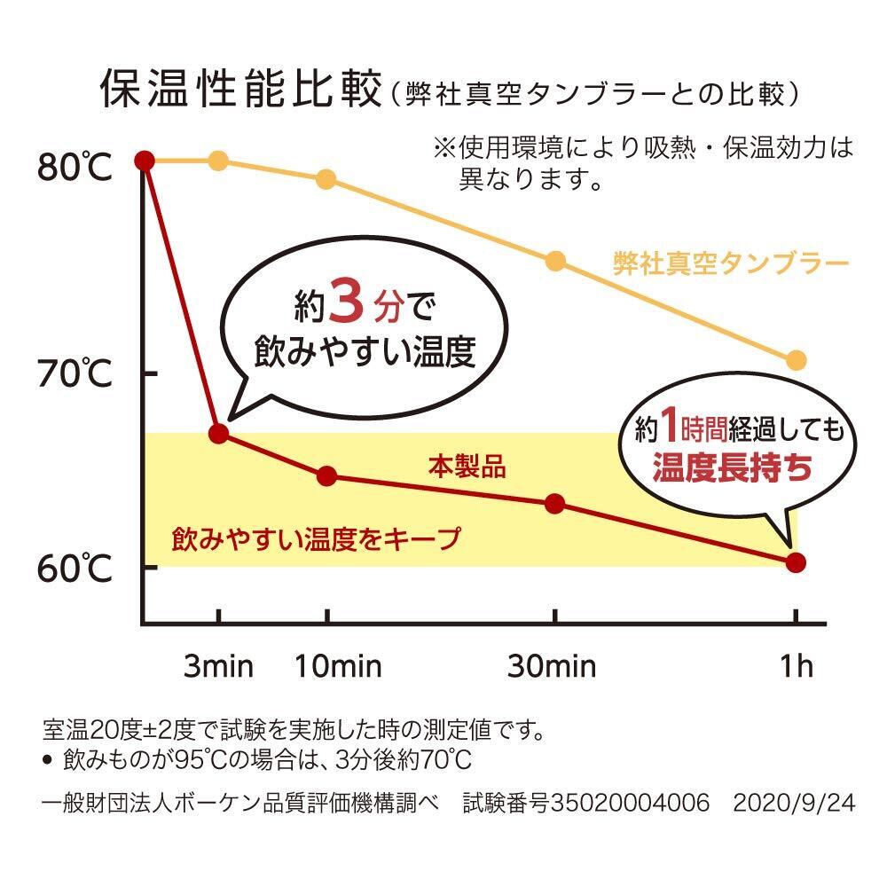 熱々の飲みものの温度を短時間で飲みやすくし、持続させるタンブラーです。冷水については、保冷効果を有します。真空+吸熱3層構造。※人により、熱さの感じ方は異なります。使用環境により保温効力は異なります。