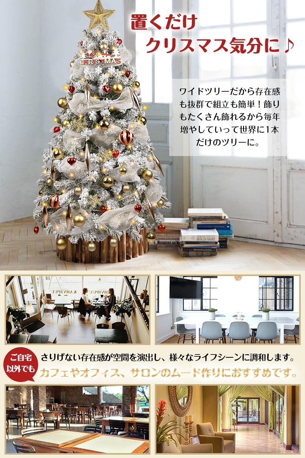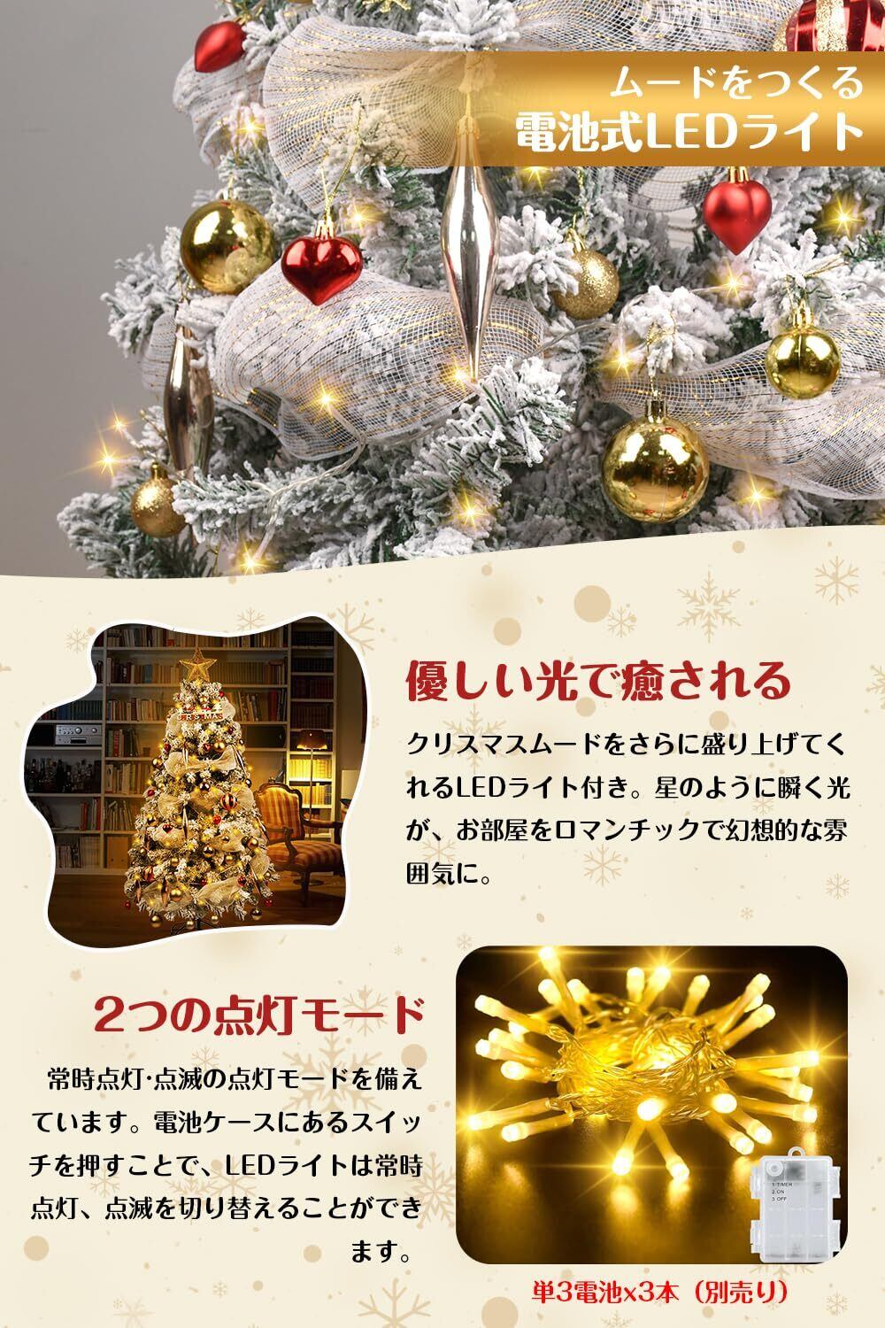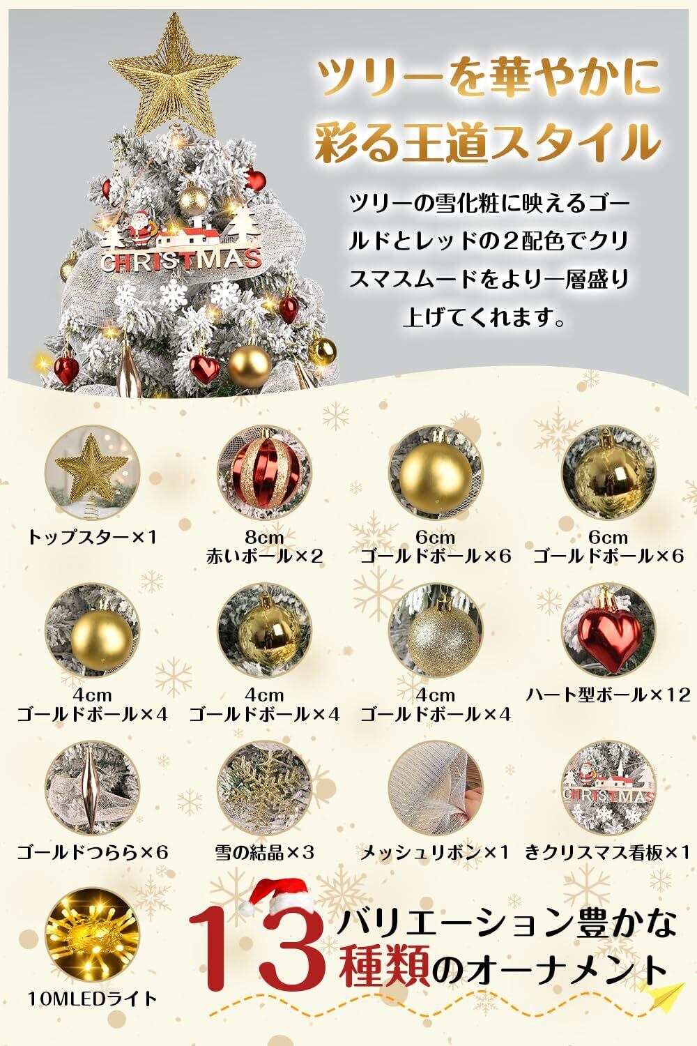 【豪華なオーナメントセット】存在感があり、華やかな印象のクリスマスツリーです。トップスター・メッシュリボン・クリスマスボールなど、全部で13種類のバラエティに富んだオーナメントが付属しています。ツリーの雪化粧に映えるゴールドとレッドの2配色でクリスマスムードをより一層盛り上げてくれます。お子様やご家族、友人たちと一緒に心ゆくまでお好みのアレンジをお楽しみください。