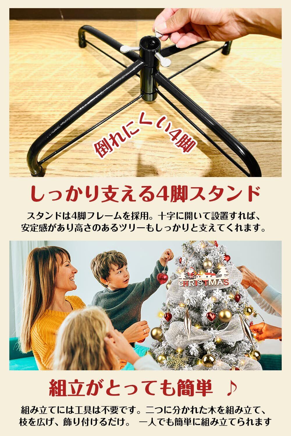 【組立簡単】2段に分かれており、傘のように開くだけで枝が広がる仕様になので、組み立ても楽々です。わずか3ステップで完成!1.鉄製のスタンドを十字の形に広げます。2.次はスタンドに本体の下段を挿しネジで留めます、続いて順番で下段の挿し込み口に本体の上段を挿し込みます。3.最後はツリーの枝葉を花の様に開けて、ボリューム感があるツリーになります。お好みのオーナメントを取り付ければ完成。