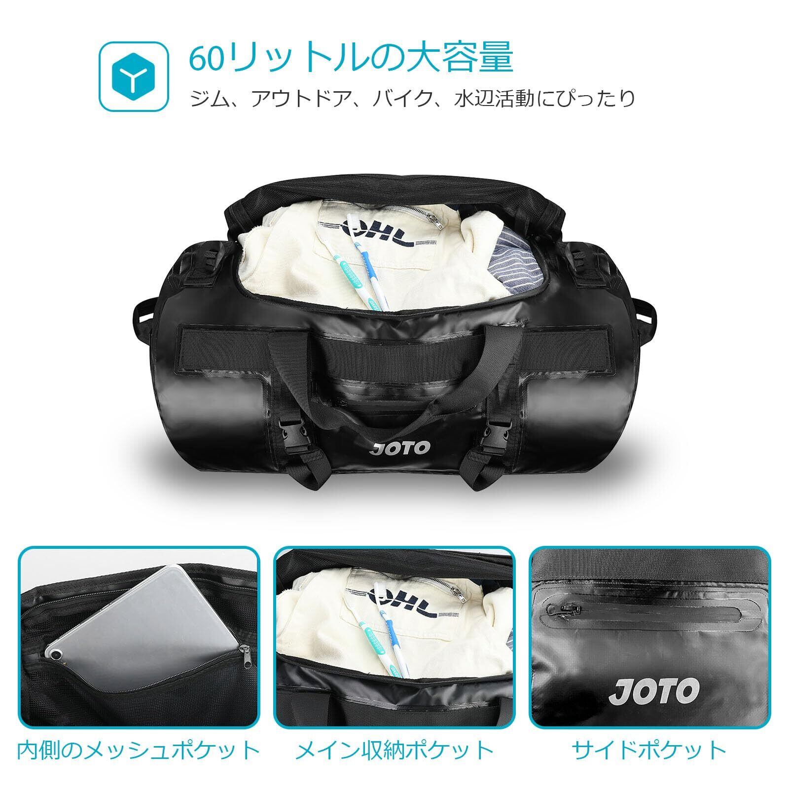 JOTO 防水バッグ 60L 大容量 3WAYタイプ ダッフルバッグ ドラムバッグ ダイビング・カヤック・バイク・登山用リュック ドライバッグ