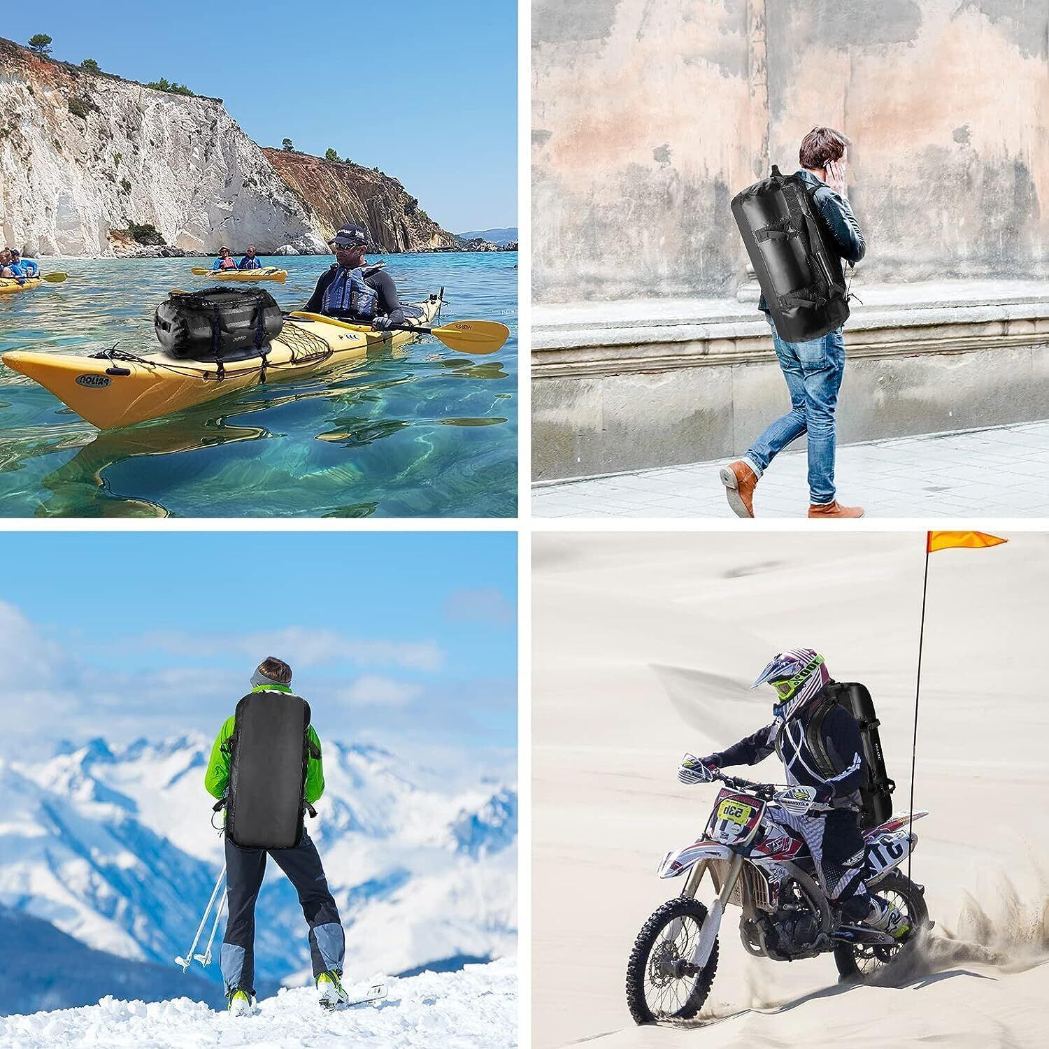 ️素材:耐久性のPVC。丈夫なので活躍の幅も広く、キャンプやバイクなどはもちろん、旅行用バッグにもぴったり。ひとつ持っていれば、さまざまなシーンで使えます。