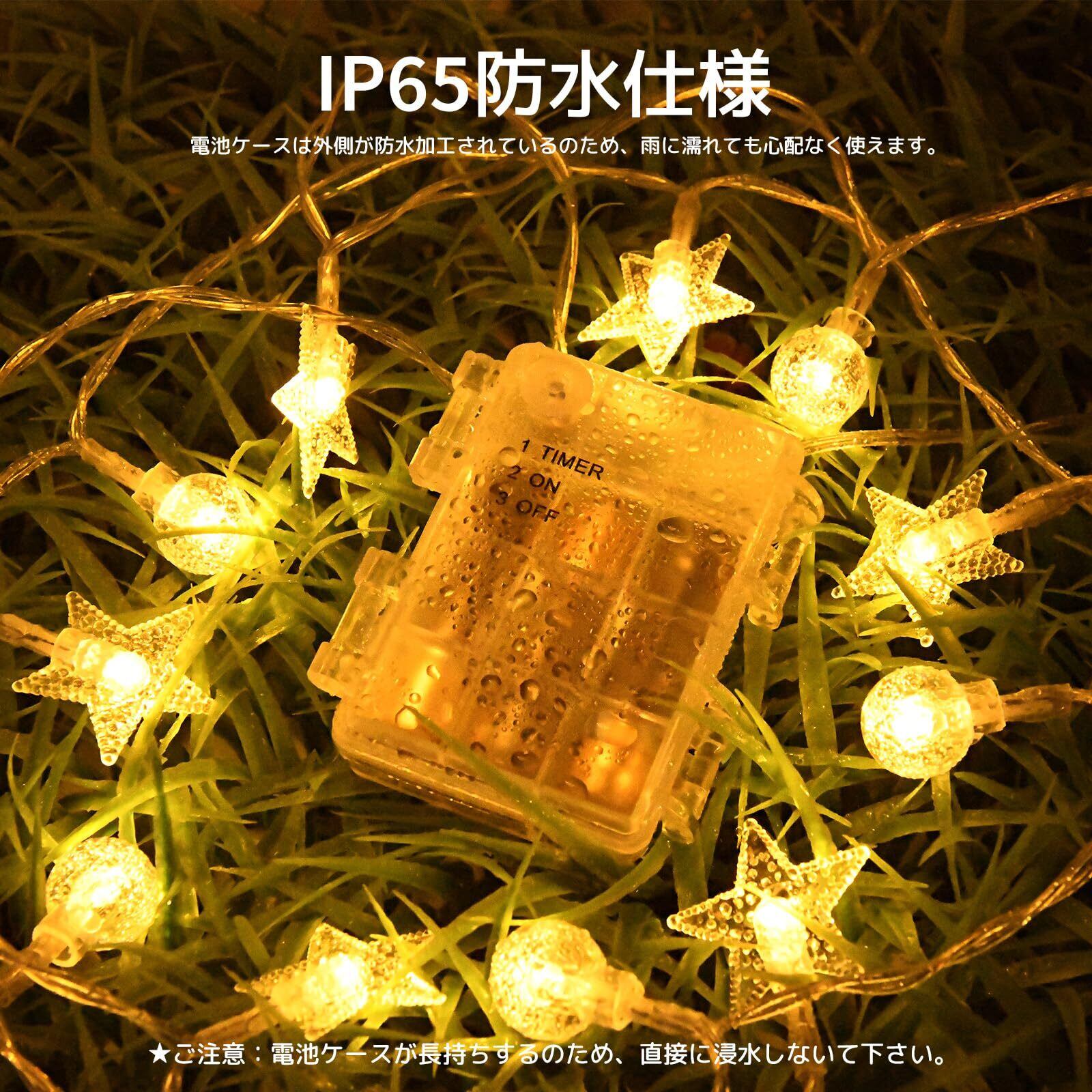 【IP65防水・屋外室内兼用】完全防水バッテリーケースによりIP65の高防水レベルが備えているこのLED イルミネーションライトはアウトドアで雨に濡れても心配なく使えますので、キャンプや庭の屋外防水電飾としてはちょうどいいです。またこのクリスマスライトはウォームカラーの発色でロマンチックかつ癒しの雰囲気を作り出せるため、室内フェアリーライトとしてはピッタリです。