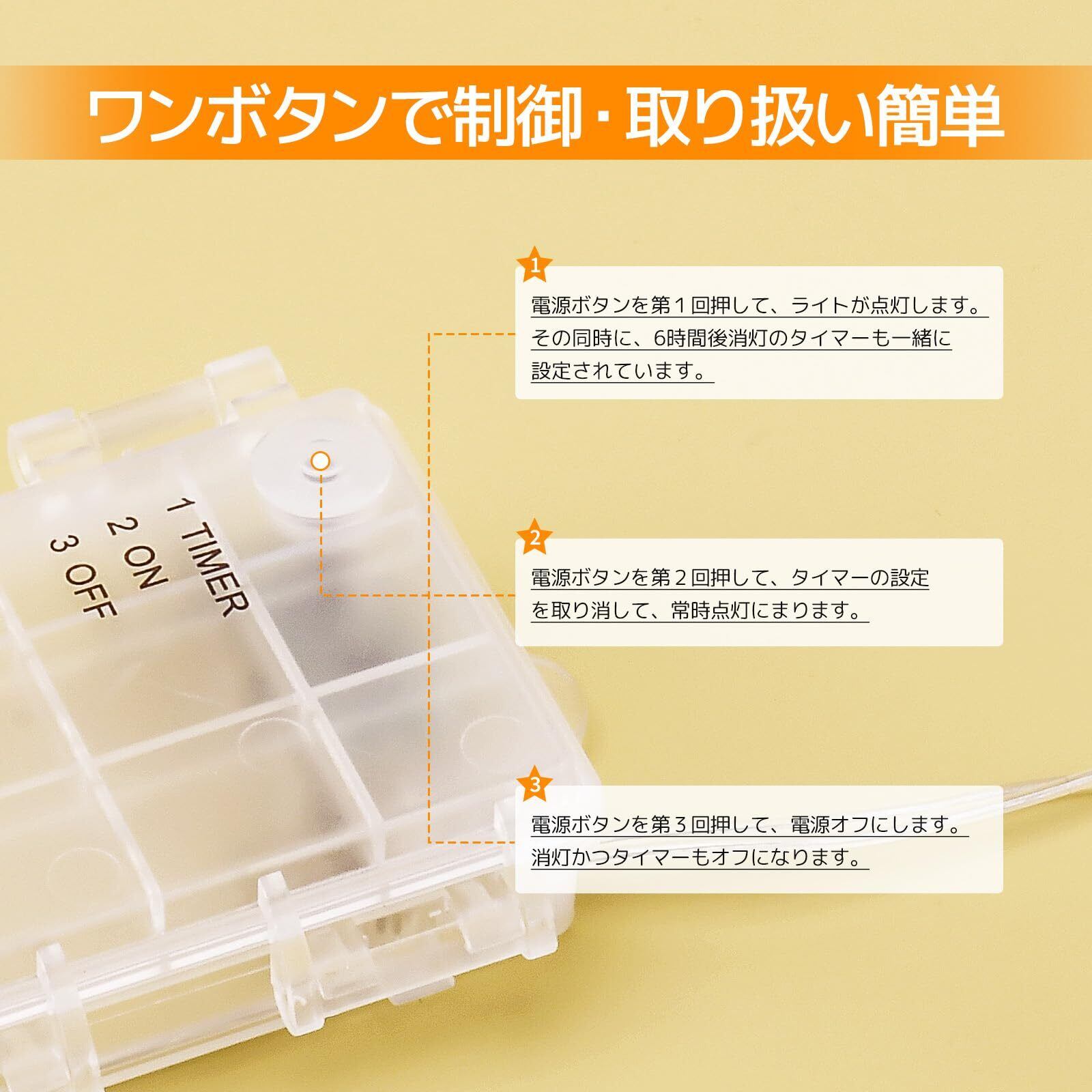 【ワンボタンで制御・取り扱い簡単】このLED ストリングライトは電源ボタンを一回ずつ押すと、電源とタイマー機能のオンとオフをコントロールできて、ワンボタン操作でとっても取り扱いが簡単です。