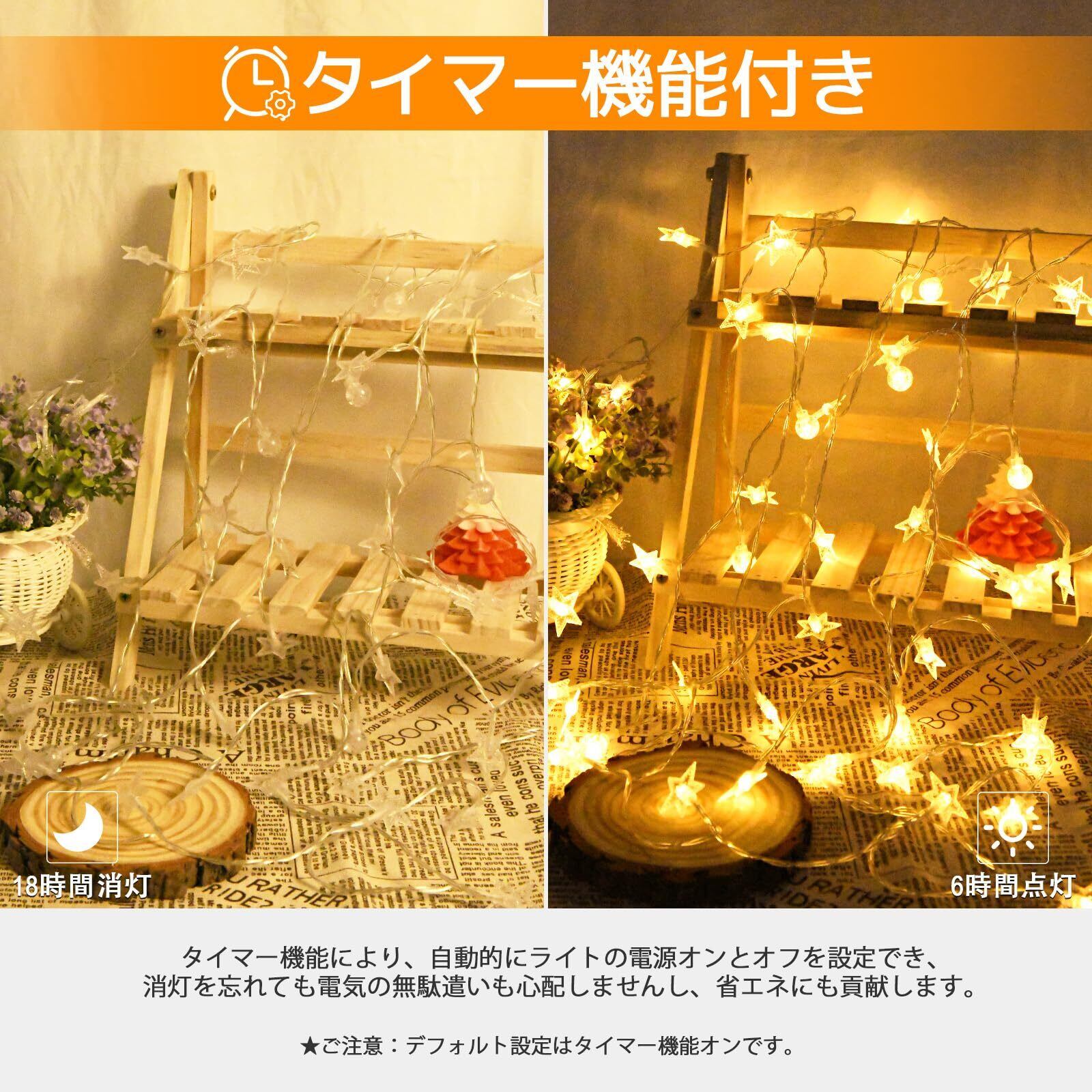【電気の無駄遣いを防ぐタイマー機能】このLED フェアリーライトは毎日ほぼ同じ時点から点灯して、約6時間後消灯すると設定できるタイマー機能が付いています。そのタイマー機能により、自動的にクリスマス イルミネーションライトの電源オンとオフを設定でき、消灯を忘れても電気の無駄遣いも心配しませんし、省エネにも貢献します。