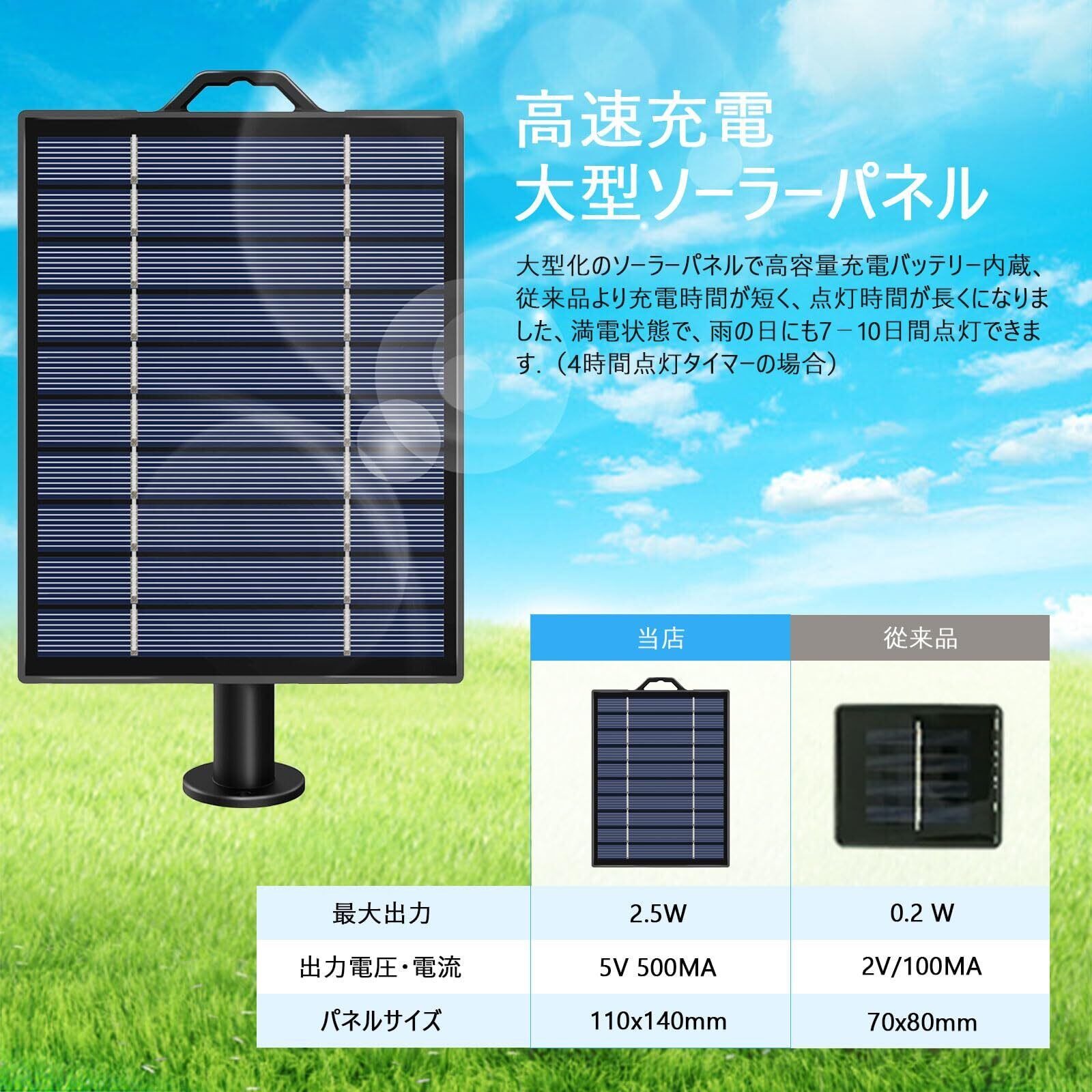 【高速充電大型ソーラーパネル】大型化のソーラーパネルで高容量充電バッテリー内蔵、従来品より充電時間が短く、点灯時間が長くになりました、満電状態で、雨の日にも7-10日間点灯できます。TypeC充電口付きで、連続の悪い日にも、ご心配なく、TypeCケープルよりソーラーパネルへ充電できます。