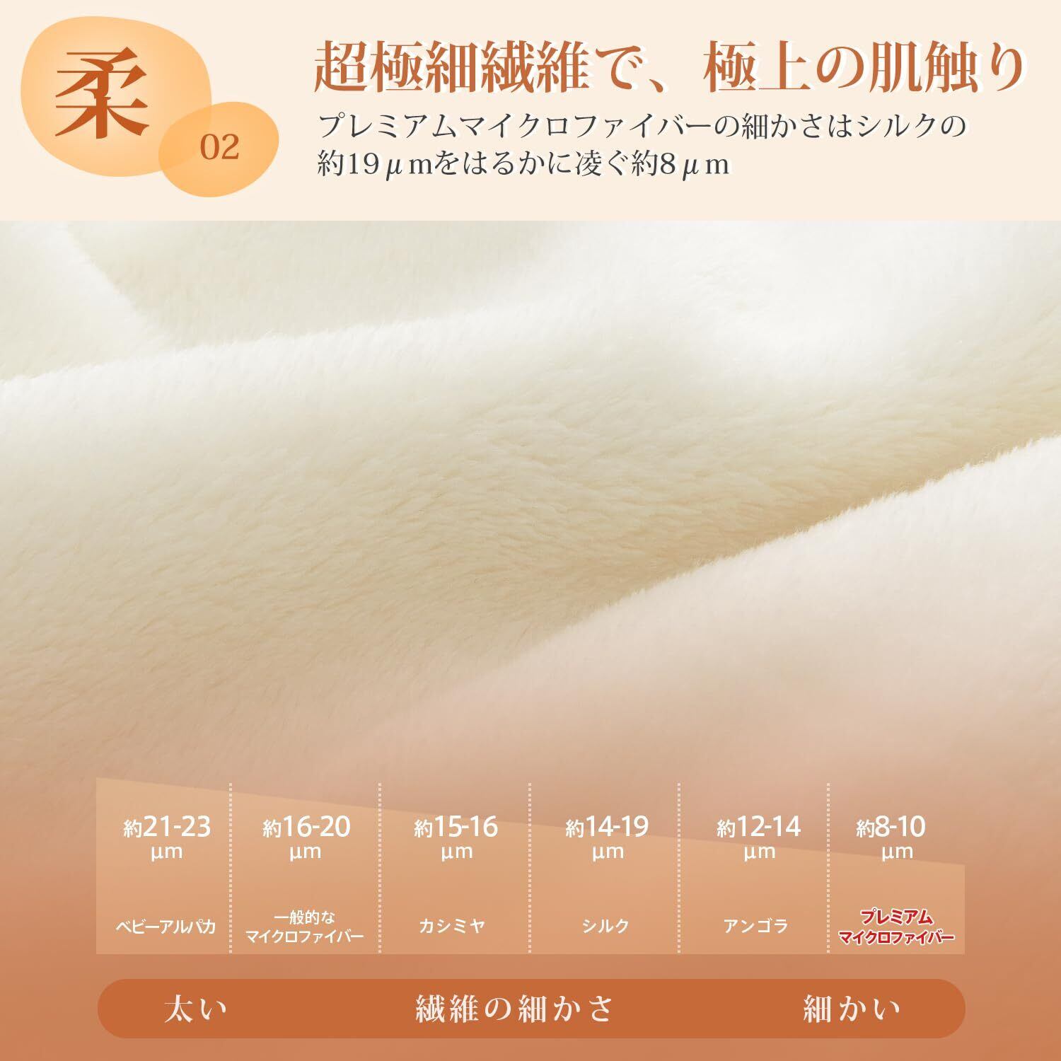 ・従来のマイクロファイバー毛布に比べて、極細繊維を使用しているため、肌触りは格別です。撫でた時の毛並みは美しい。その違いを肌で実感頂けます。