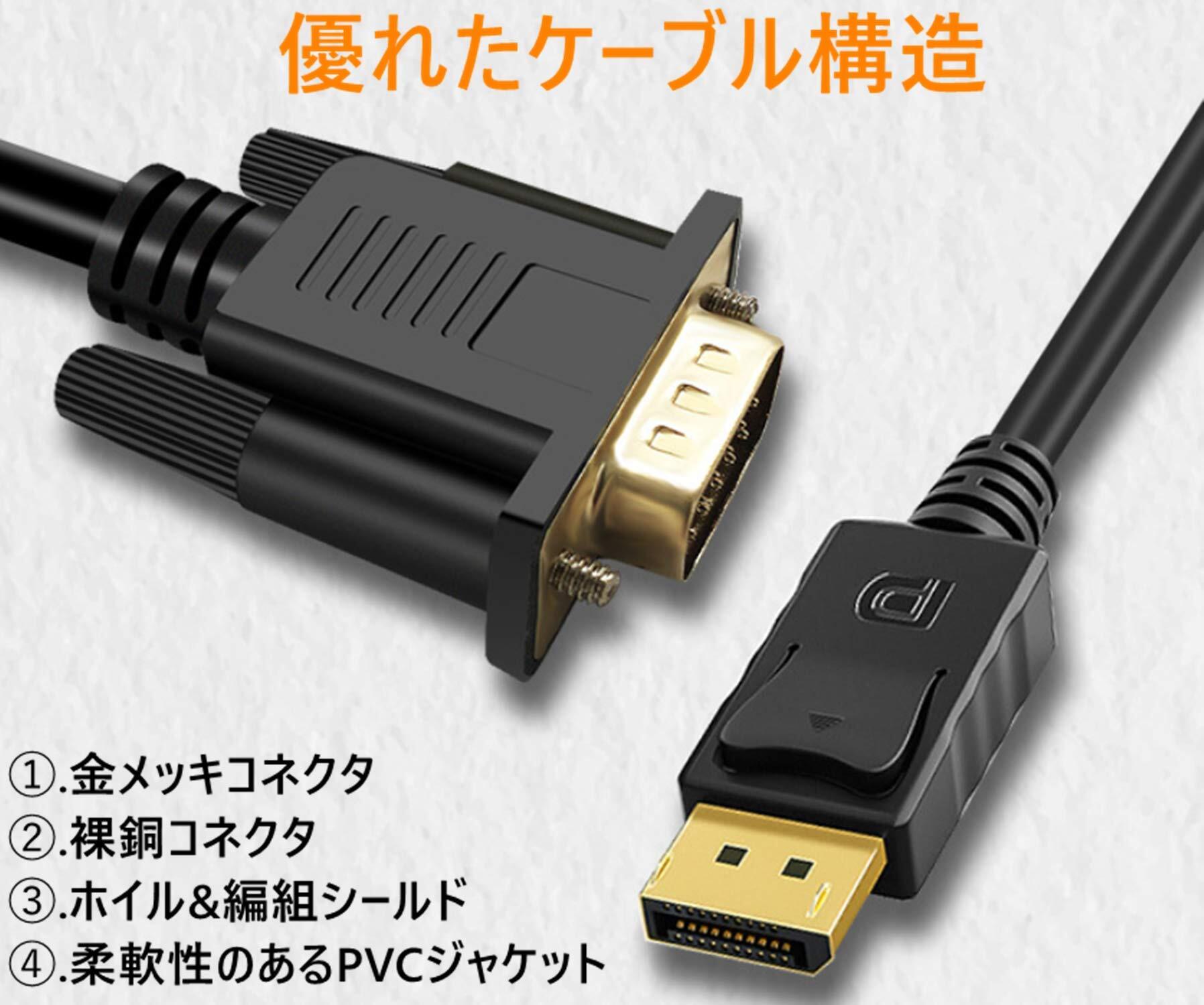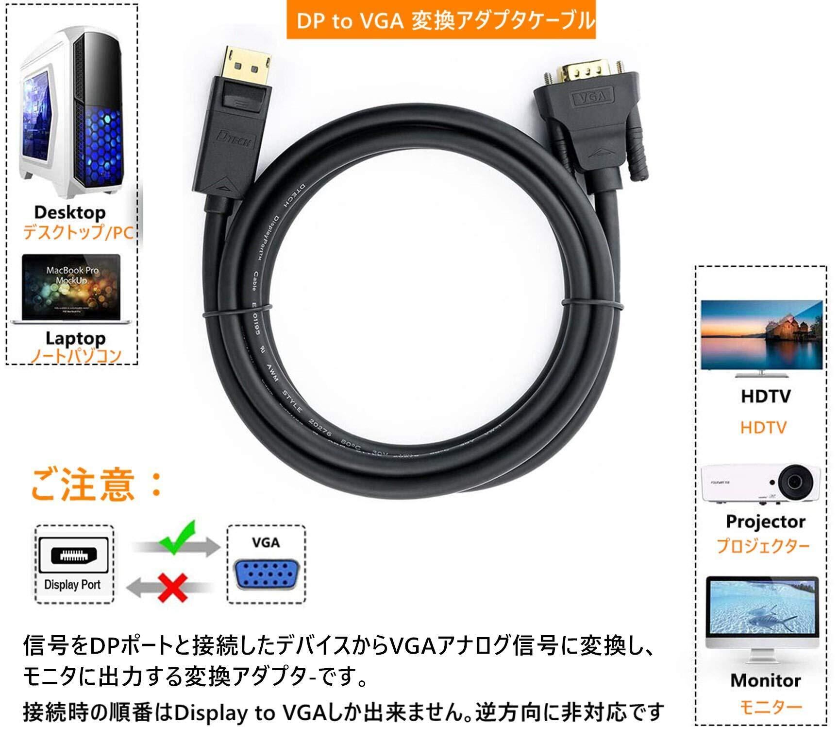 DP to VGA 変換ケーブル:【逆変換不可】本製品はDisplayPort出力を、VGA入力に接続するための変換ケーブルです。逆方向のVGAポートからDisplayPortへは変換不可です。D-sub入力しかないディスプレイ+ディスプレイポート出力しかないPCに最適です。即ち、Displayportを搭載した機器から、VGA端子搭載の液晶ディスプレイやプロジェクターへの接続が可能になります。DPオス側にラッチ付きですので、安定&安心な接続を提供いたします。ビデオストリーミング、ゲーム、または作業環境を拡張するのに最適です。