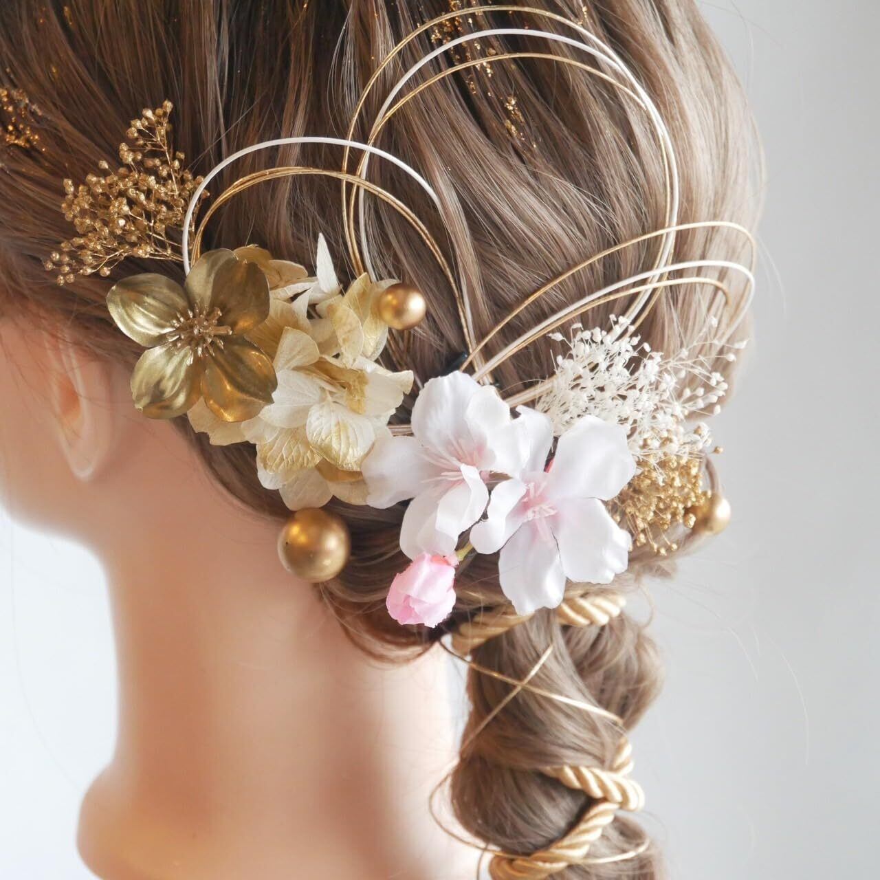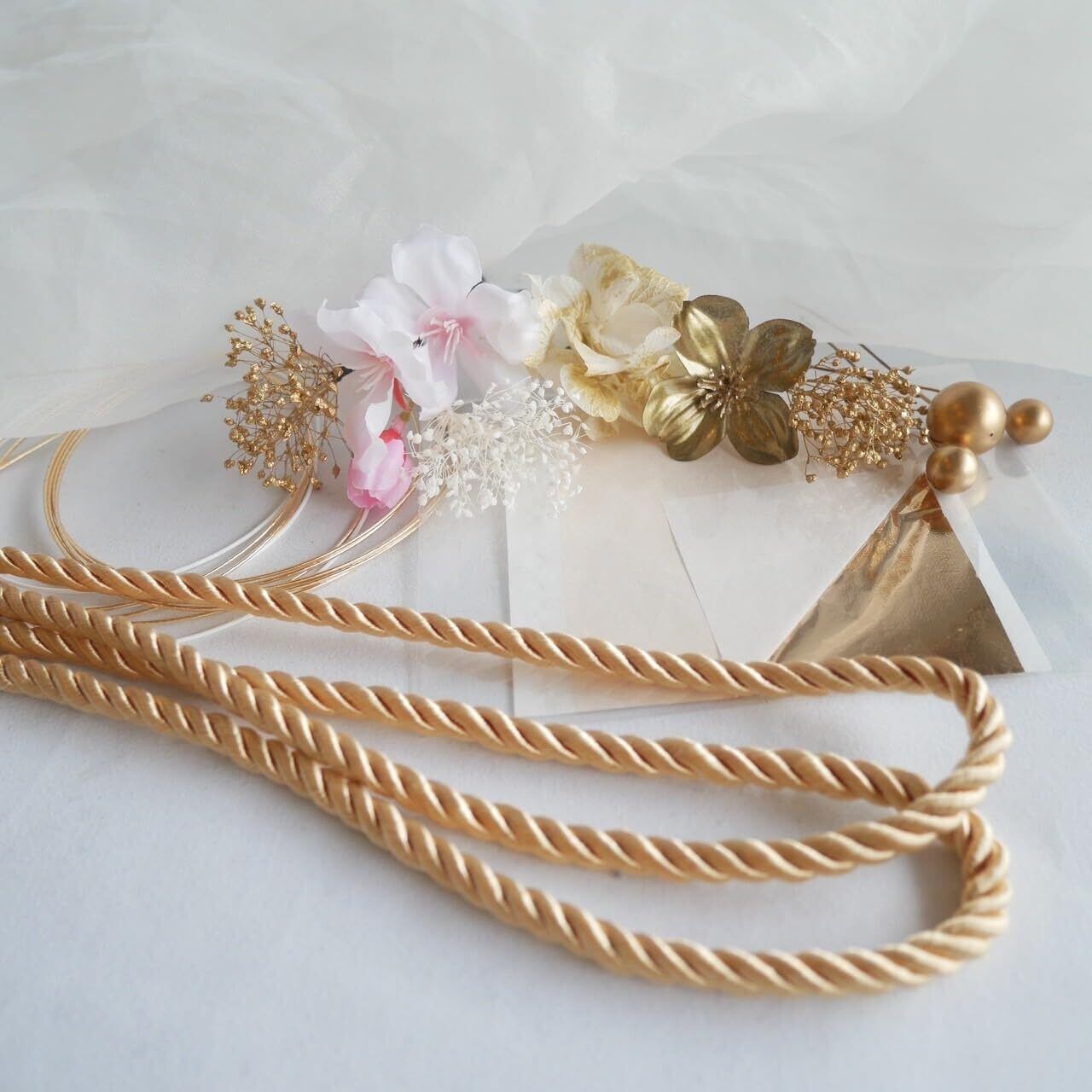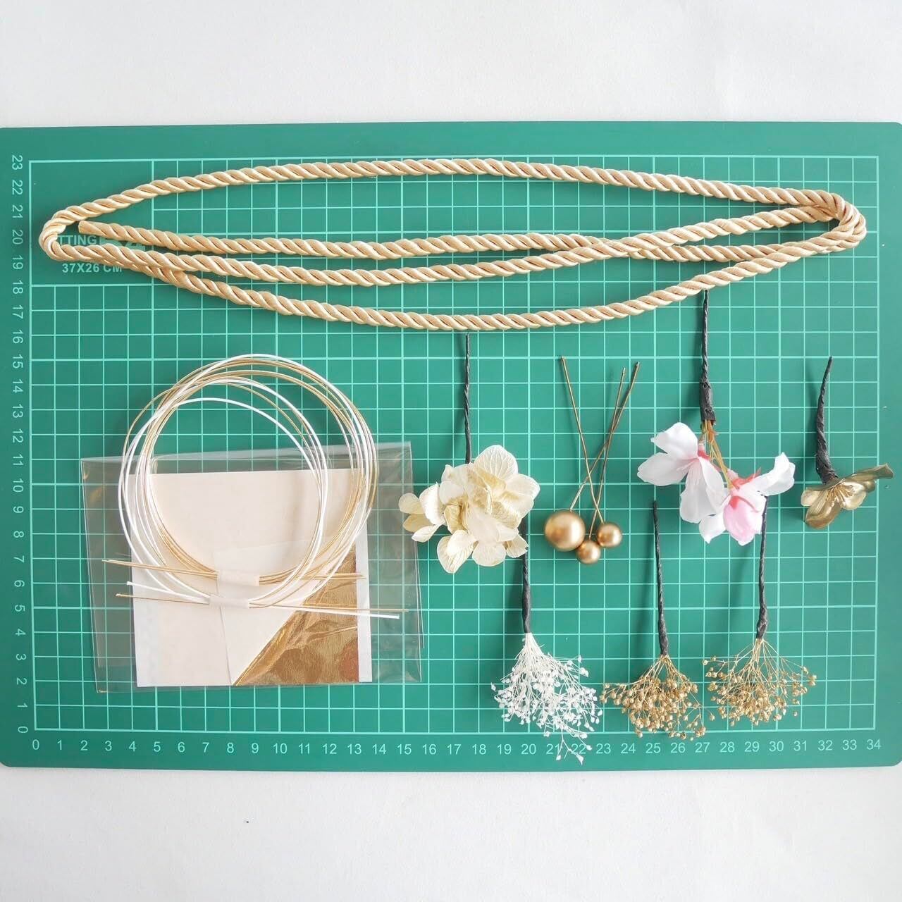 ︎パーツ詳細︎ドライフラワー4パーツ、水引2本(約90センチ、水引はご自由にアレンジいただけます)、ゴールド紫陽花ピック、ゴールドメッシュピック、組紐 約130cm、金箔