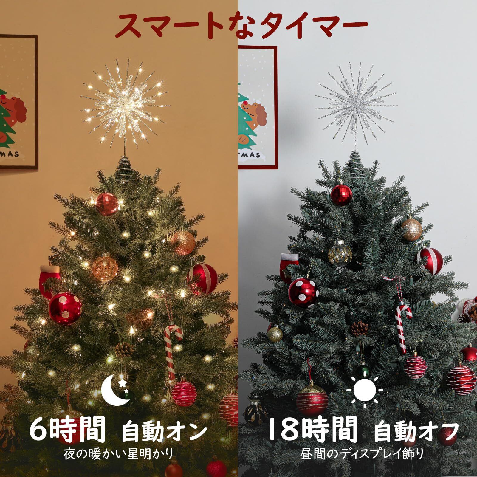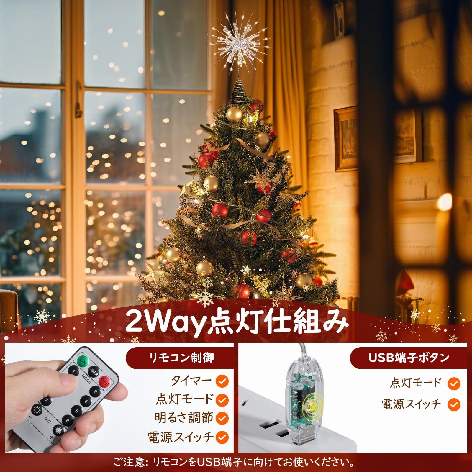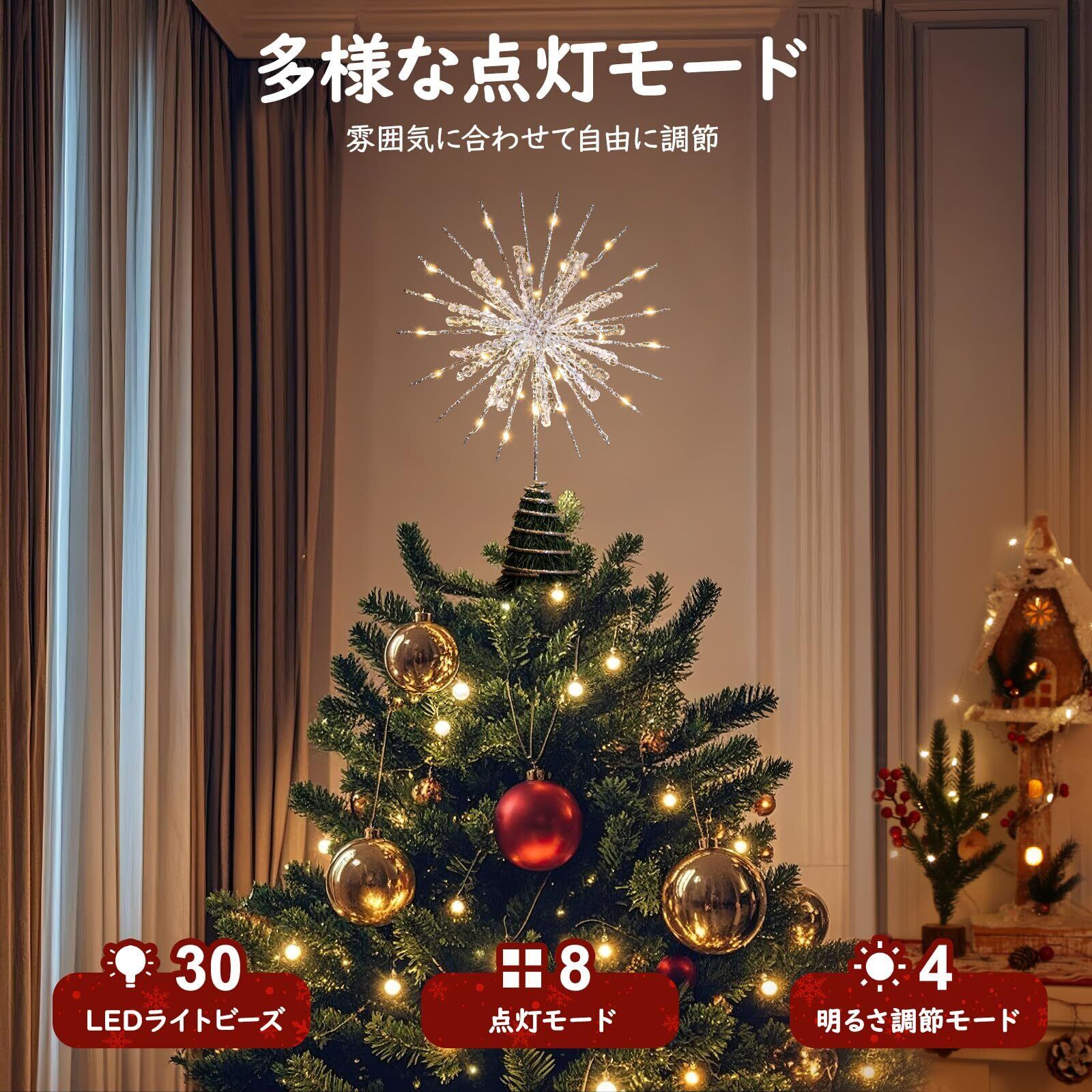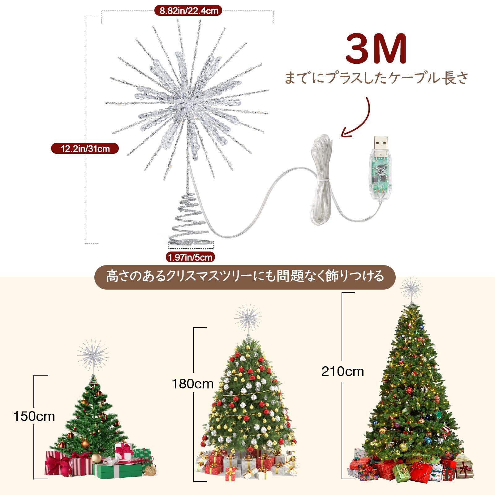 「ツリーを幻想的に演出」星中身には30枚のLEDピーズが施されており、長さを3Mまでにプラスした扱いやすい簡単なUSBケーブル給電仕組みより、スイッチを入れるだけで、すぐに上品な輝きを放ち、ツリートップを鮮やかにライトアップできて、更に8種類の点灯モードより、雰囲気に合わせて点滅や点灯スピードなどを調節可能で、クリスマスツリーを幻想的に演出させて、より楽しむことができます。