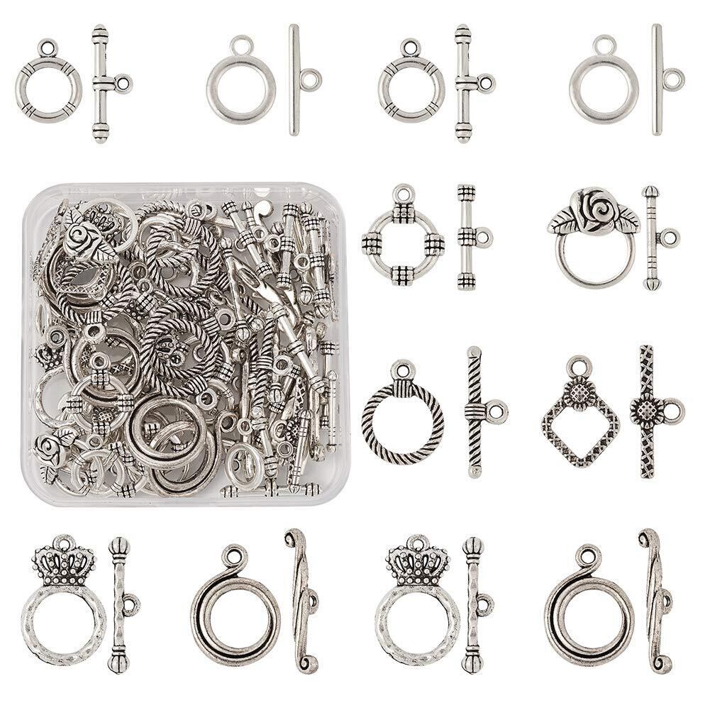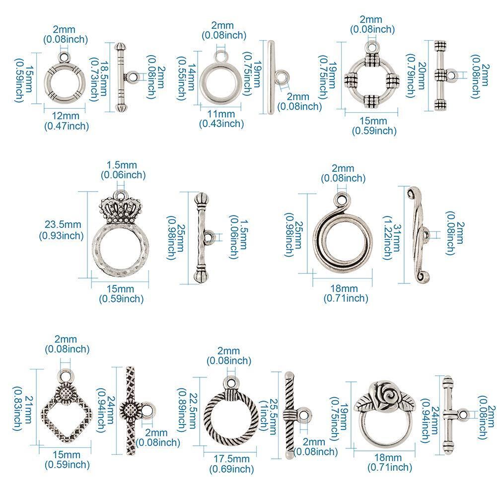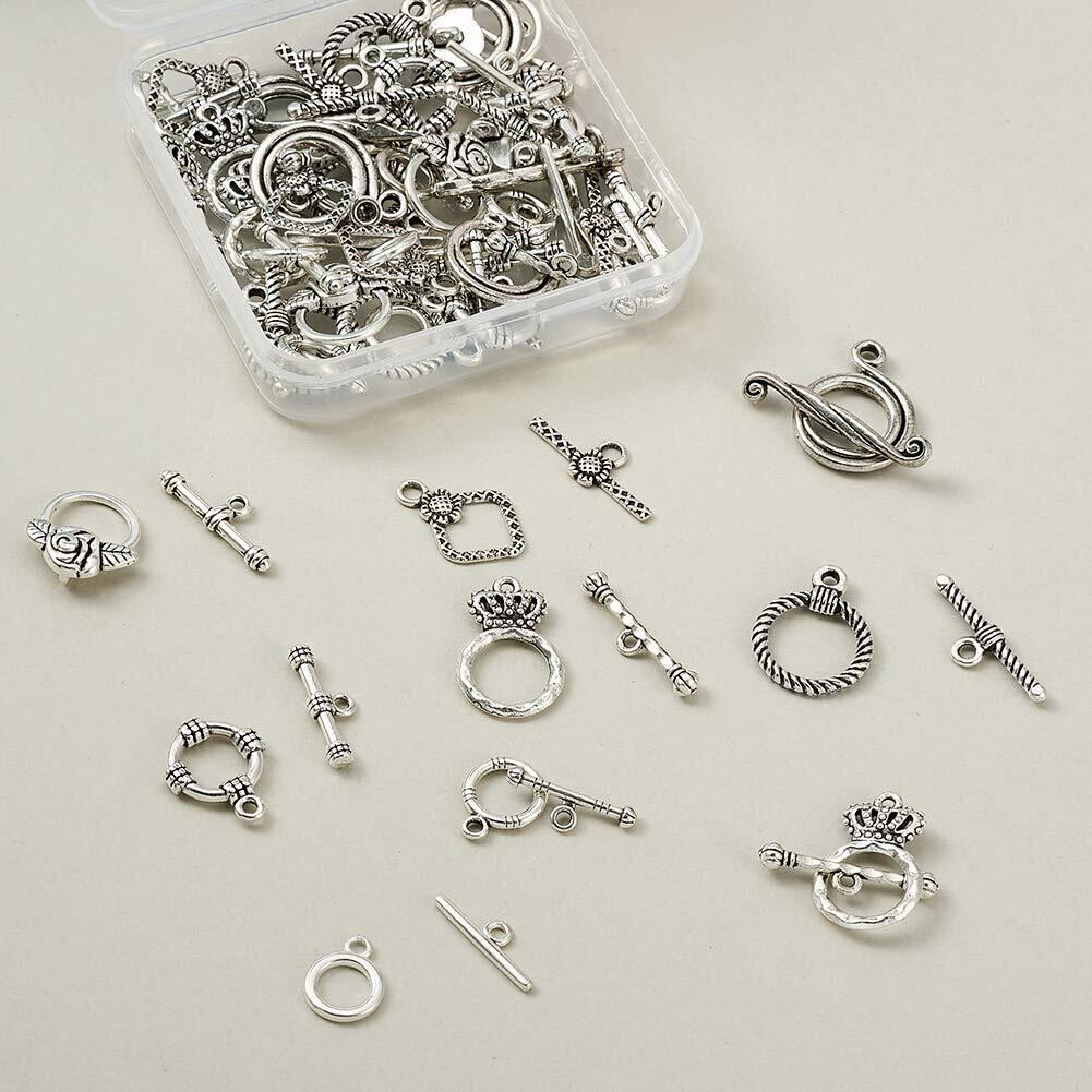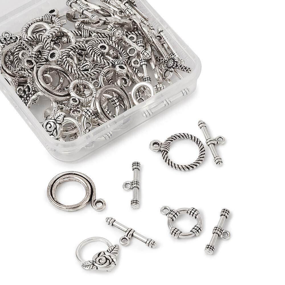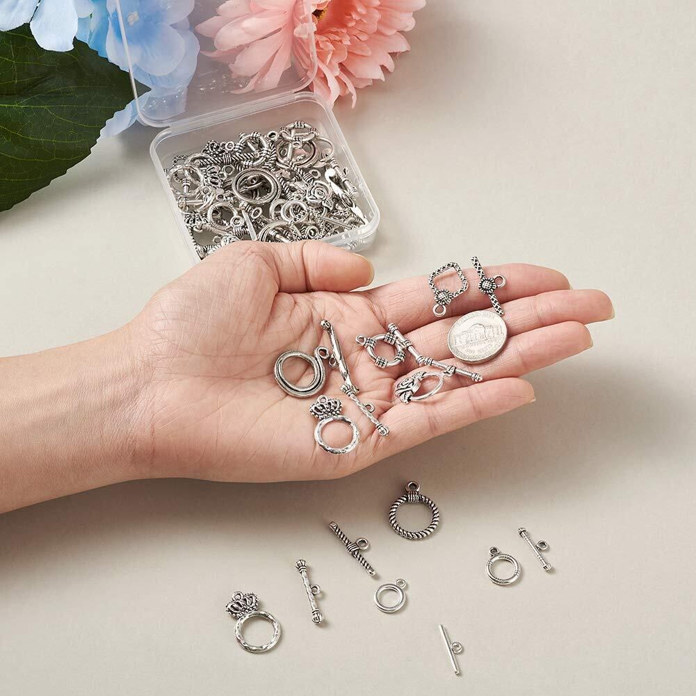 Beadthoven 約40組/箱 8種類 アンティークシルバー 合金製 マンテル 輪 マンテルリング 留め具 金具パーツ トグル エンドパーツ アクセサリーパーツ ジュエリー用 DIY ハンドメイド 手芸材料 手作り素材 クラフト用品