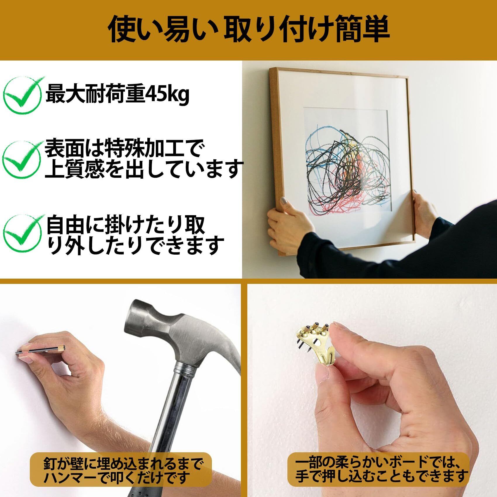 【安定性は抜群、耐久性も十分】3本針フックと頑丈なベースで最大耐荷重45kg。絵画 フック 毎日の壁掛け収納のニーズに簡単に対応できます。絵画吊り金具品質が良いステンレスを採用し、錆びにくく、長持ちです、光沢度が変わりません。壁掛けフック 絵画、キラキラしている金色、どこでも輝いていて、お部屋の良い飾りになります!