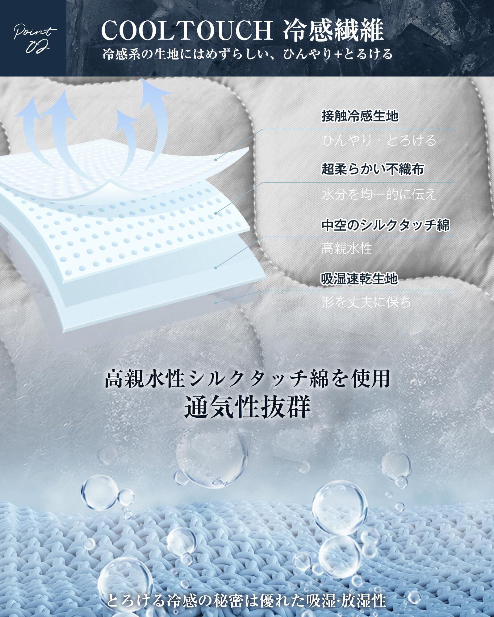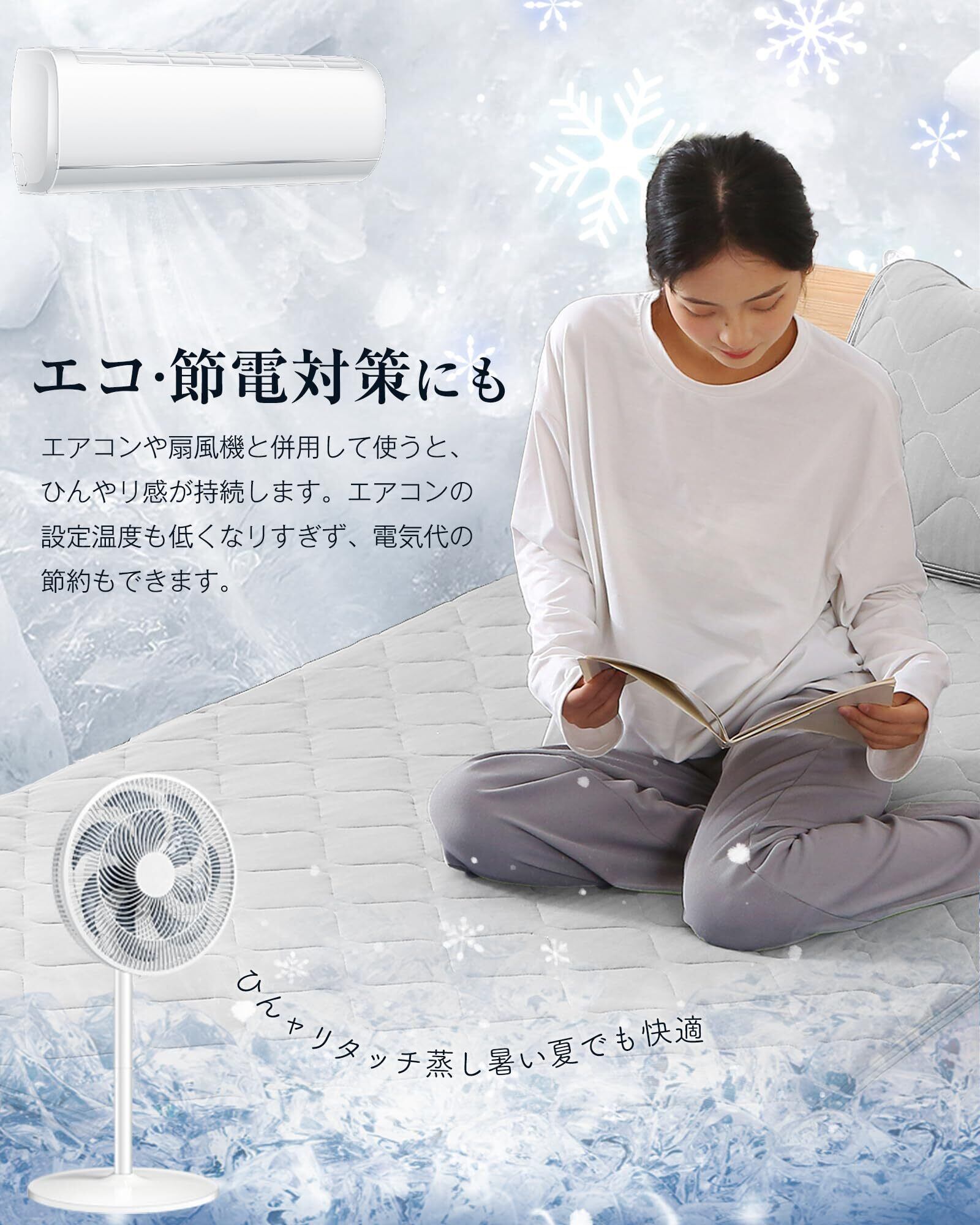 【ひんやり敷きパッド】接触冷感と吸汗機能をもつ冷感新素材を採用します。一般の冷感敷きパッドに比べ、ひんやり感がグレードアップ!ひんやり、サラサラ、快適な寝心地に! ! 冷房との併用でひんやり度がさらにUP! 入浴後や日焼けした後の火照った体を、冷たい敷きパッドでクールダウン! ひんやり冷たくて気持ちいいので、寝苦しい夜も快適な眠り夏の快眠グッズとして、ギフト用にも大変喜ばれています! 接触冷感の冷たさはお部屋の気温にも左右されますので、ひんやり感を高めたいなら、使用前に冷房等でお部屋を冷やしておくことをオススメします。(エアコンの温度設定は26~29℃がおすすめ)。弊店ではエアコンを使いすぎない健やかな眠りを提案するクール寝具は他にも取り扱っています。一緒にセットで使えばさらにクール~暑い夏、蒸し暑い夜、梅雨のじめじめした夜に!