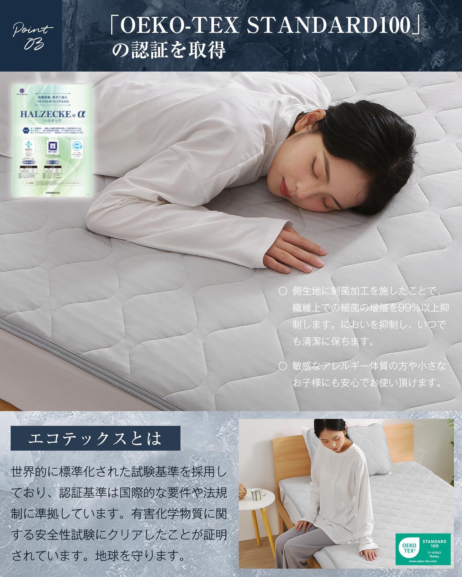 【吸湿速乾・通気性】生地の織り方を変えることで吸水性を高めることができました。汗のにじむ夏の夜でも肌にまとわりつかず、朝までサラサラ快適に快眠できます。吸水性と通気性に優れた素材のため、敷きパッドは汗などの水分をたっぷり吸収し、こもった水分を拡散させ、速乾してさらっと快適にお使いいただけます。通気性のいい構造と吸湿性の高い素材を使用しており、熱さも湿気も素早く吸収して放出します。汗をかきやすい夏だから、 中綿はウイルスを寄せ付けない清潔快適わたを使用しました。防ダニ・抗菌・防臭の三つの機能をもつだけでなく、軽量で通気性がよく、ヘタリにくいのも特長です。