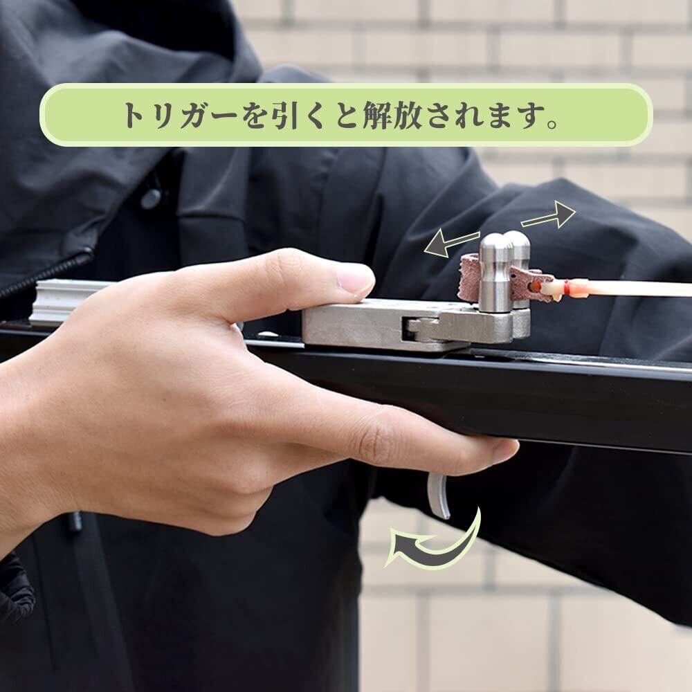 魚釣り矢の発射:ランチャーを長い棒に固定したら、魚釣り矢を入れたゴムを発射装置のところに引っ張り、トリガーを引いて固定し、目標をロックしてトリガーを引くと魚釣り矢を発射することができます。