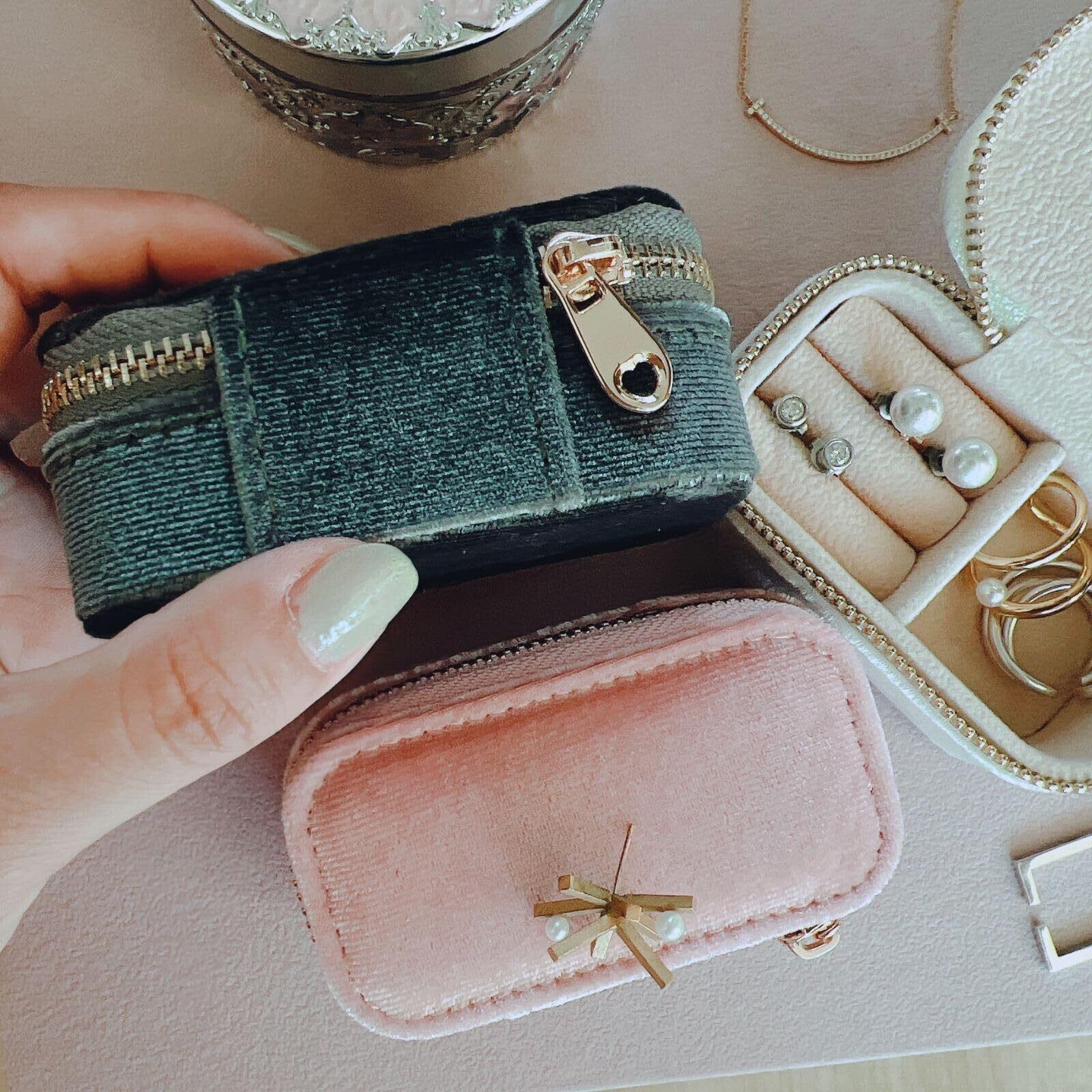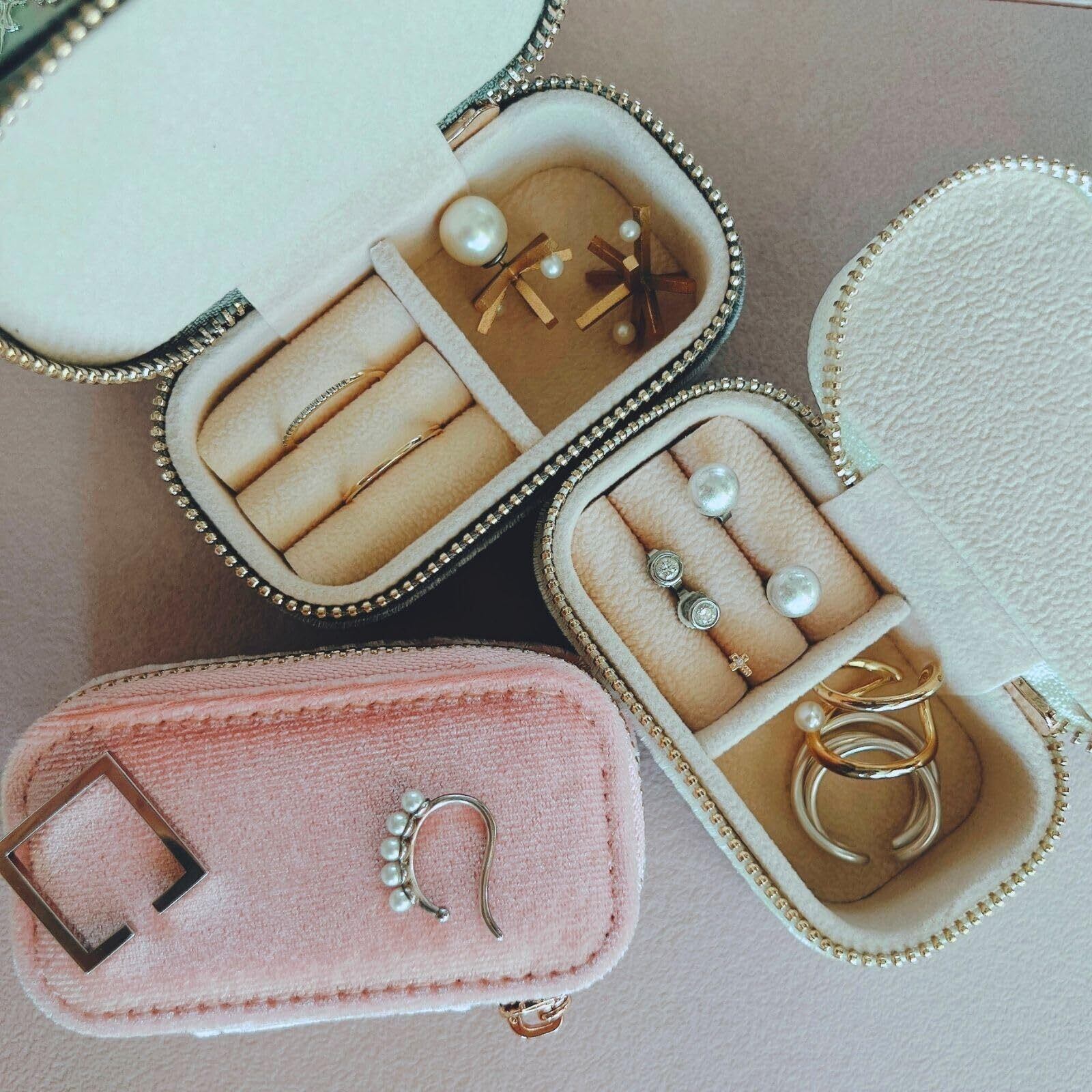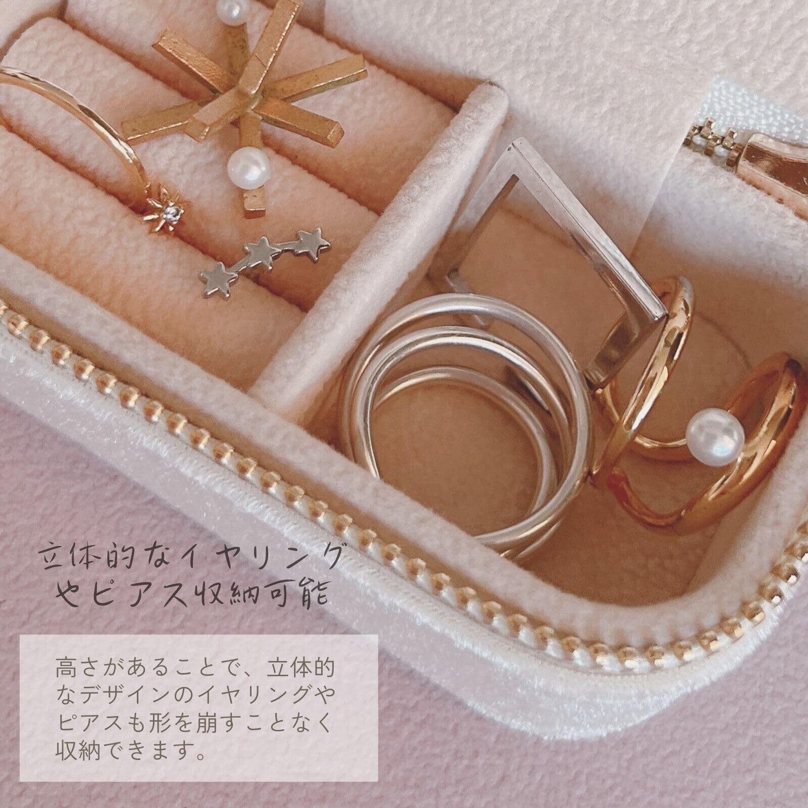 軽量でありながら耐久性に優れたソフトベルベット素材を採用。内部にはジュエリーを個別に収納できる仕切りを設け、ファスナーも付き、紛失や絡まりを防ぎます。ジム、ヨガ、出張、旅行先で大切なアクセサリを楽に保管。