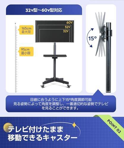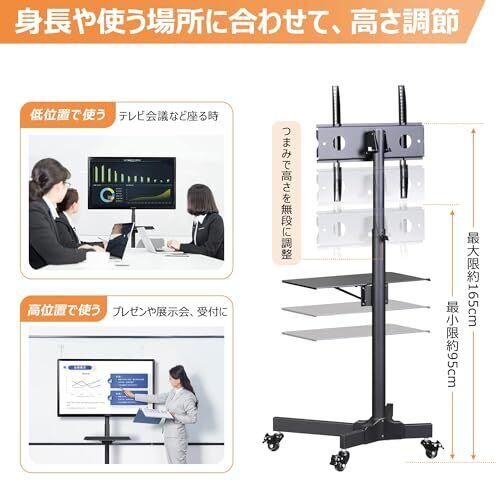 【高さ・角度調節】高さが金具の取り付け位置により、使用場所に応じて95cmから165cmまで調節可能です。また、ラックの角度が上下15度調整できて、画面を見やすい角度に設置可能です。