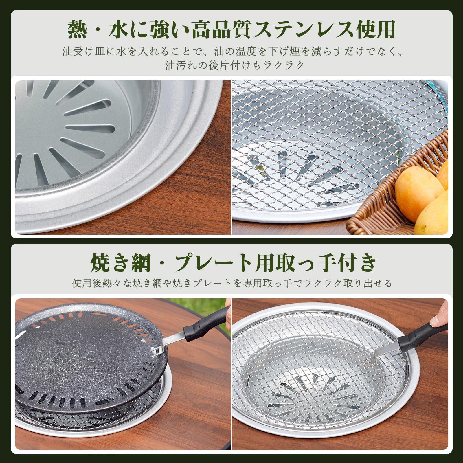 【商品仕様】本体サイズ:約60*60*45cm。本体重量:3.6kg。耐荷重:50KG。付属品:付け替え天板、炭受け、油受け、焼き網、焼きプレート、取っ手、収納袋。1年間メーカー保証。