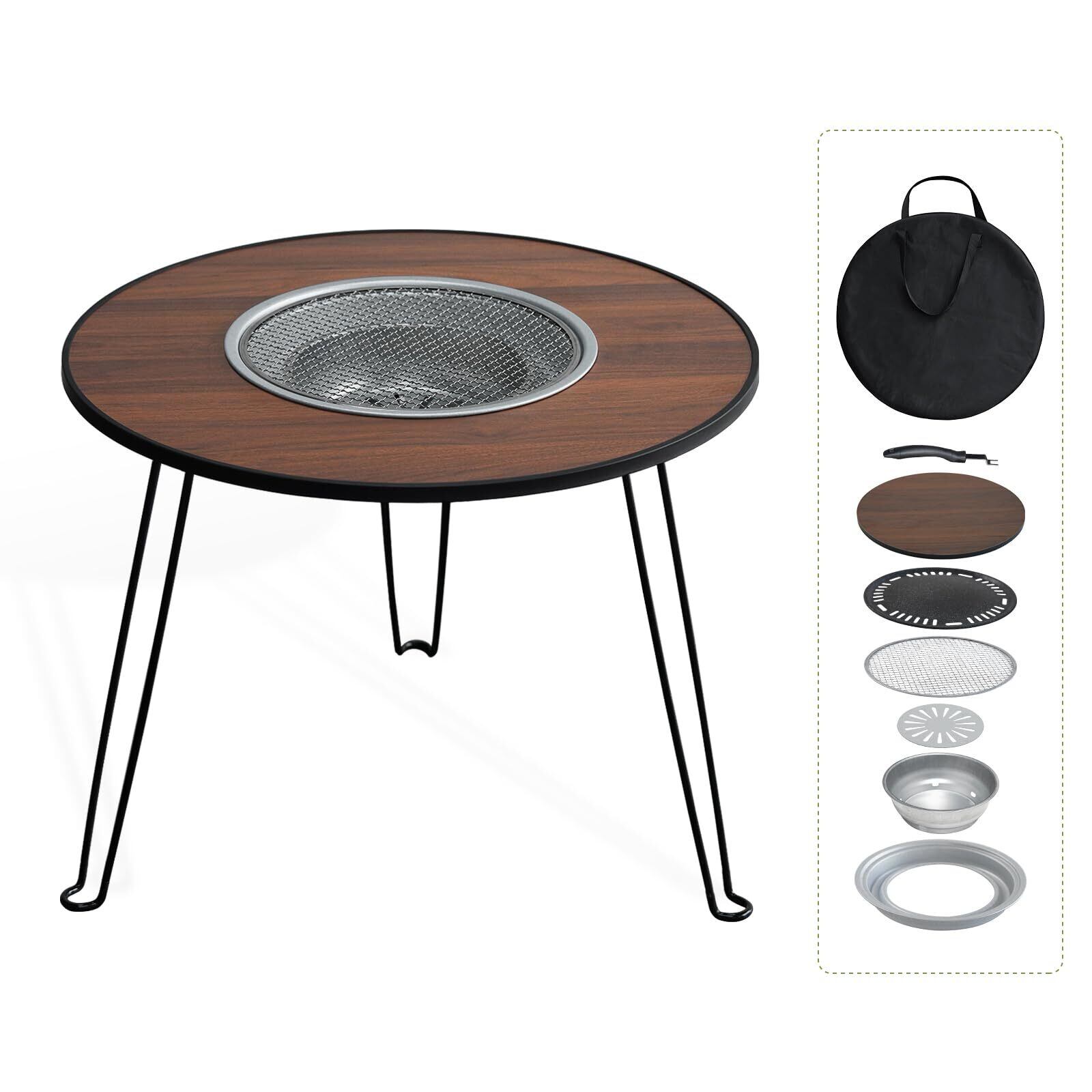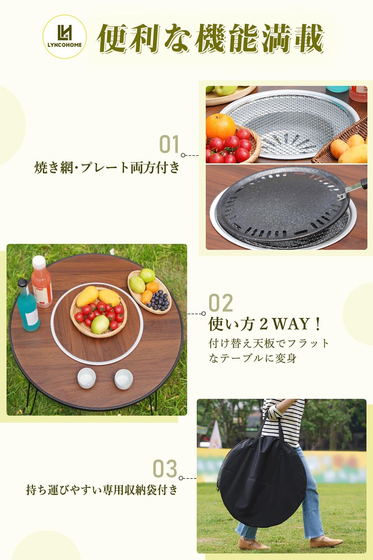 LYNCOHOME アウトドアテーブル BBQテーブル 焼肉コンロ 焚き火 折りたたみ式 キャンプ コンパクト 焼網 焼きプレート付き ソロキャンプ 幅60