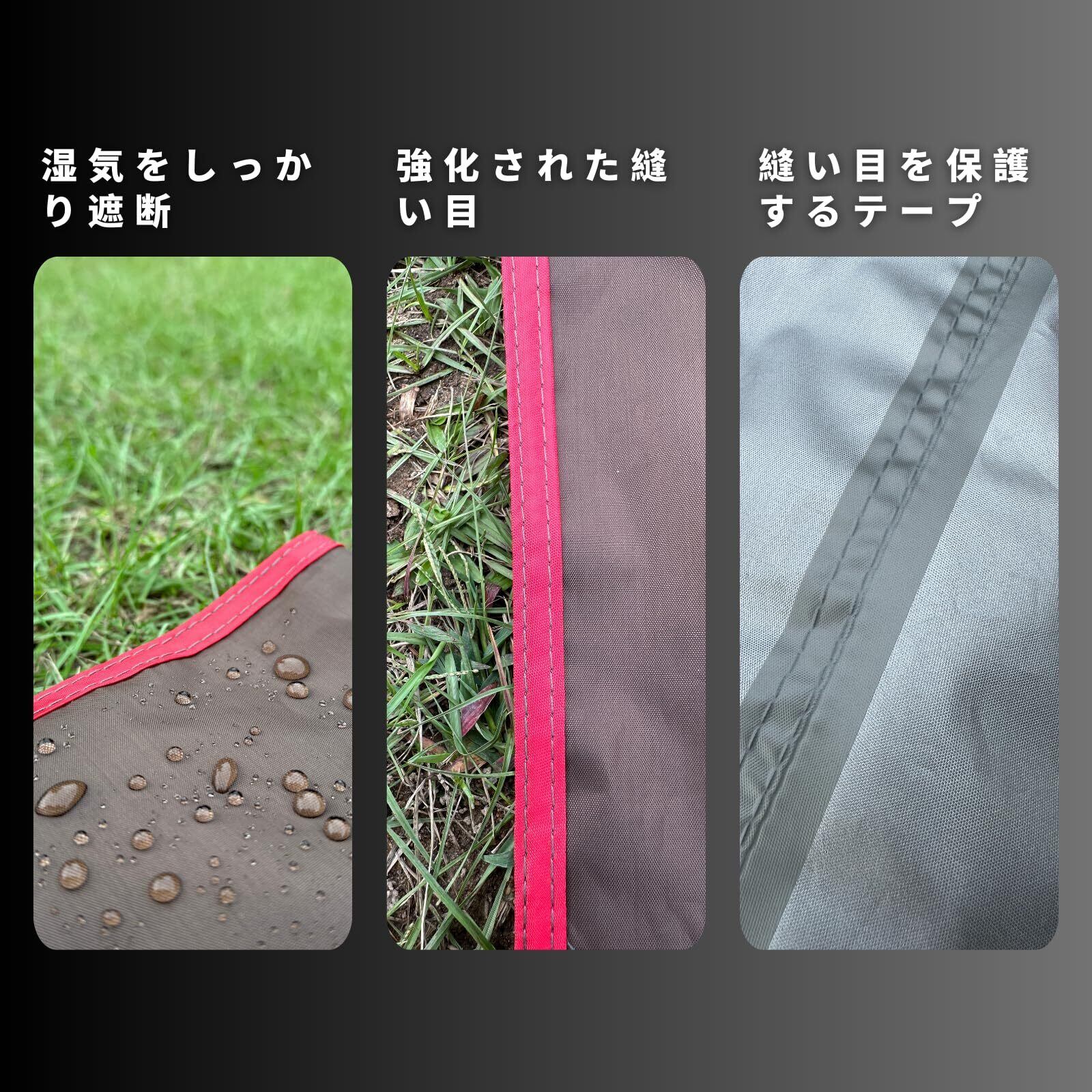 【防水加工&収納袋付き】テントシートは210Dポリエステルオックス素材を使用しており、薄い素材よりも耐久性があります。耐摩耗性にも優れ、長年の使用でも摩耗しにくく、耐久性も高いです。防水性と耐久性を兼ね備えたテントシートで、防水効果に優れたPUコーティングが施されており、耐水圧3000mmです。地面からの湿気や浸水をシャットアウトし、ハトメも補強されています。ペグで固定することができ、ショックコードも搭載されているため、取り付けは簡単です。
