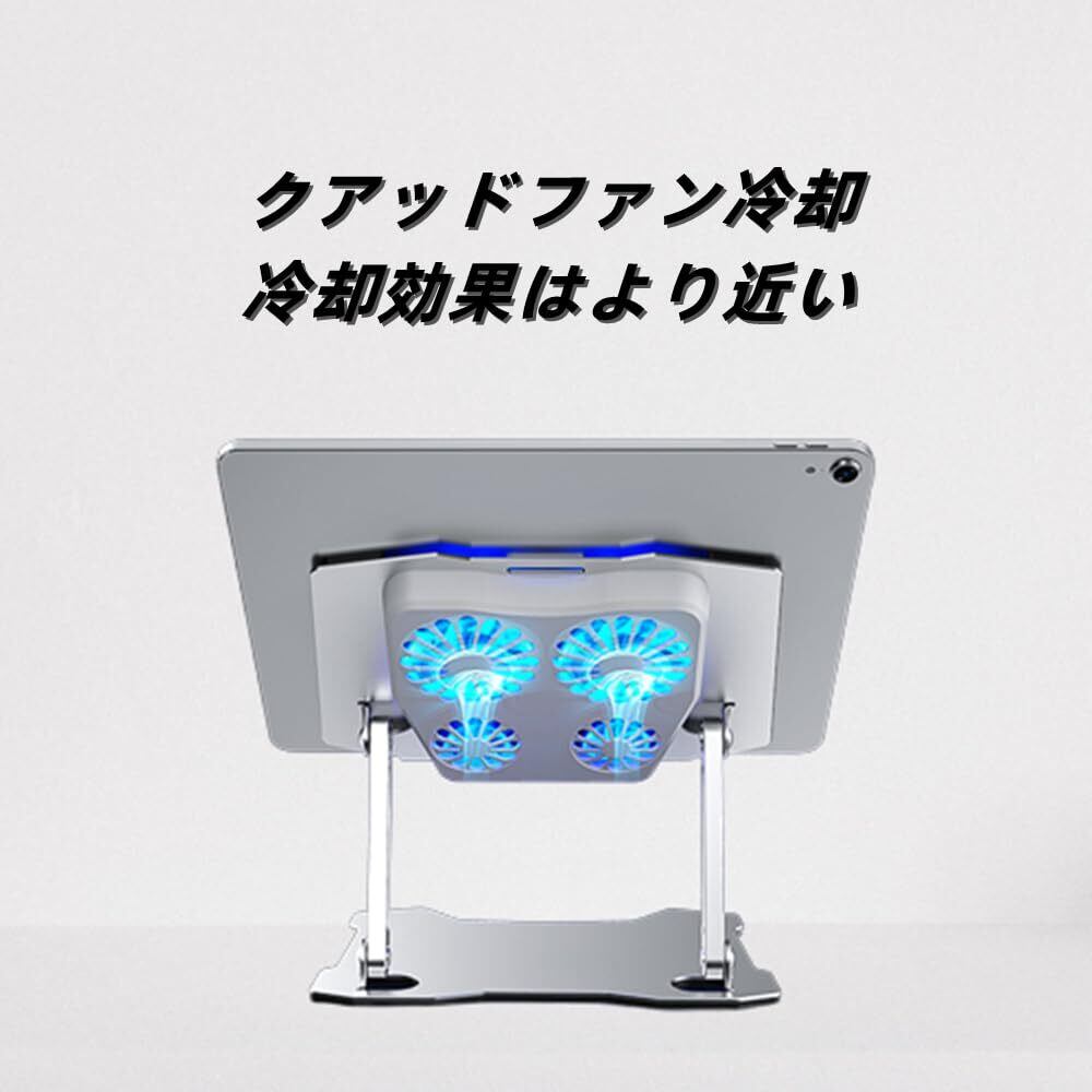 4つのタブレット 冷却:6cmの冷却ファン2つと4cmの冷却ファン2つが大量の風量を発生し、熱をより速く放散し、夏場の長時間使用によるタブレットの温度上昇を効果的に制御し、高温の熱からタブレットを保護します。冷却スタンド