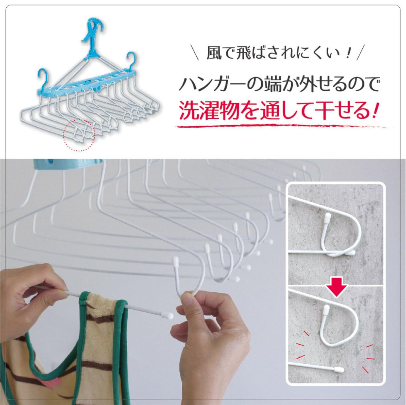 ・洗濯物を直接引っぱってはずしたりフックやハンガーに対して必要以上に力を入れて扱うと、ハンガーや洗濯物が破損したりケガをすることがあります。取り扱い時はご注意ください。
