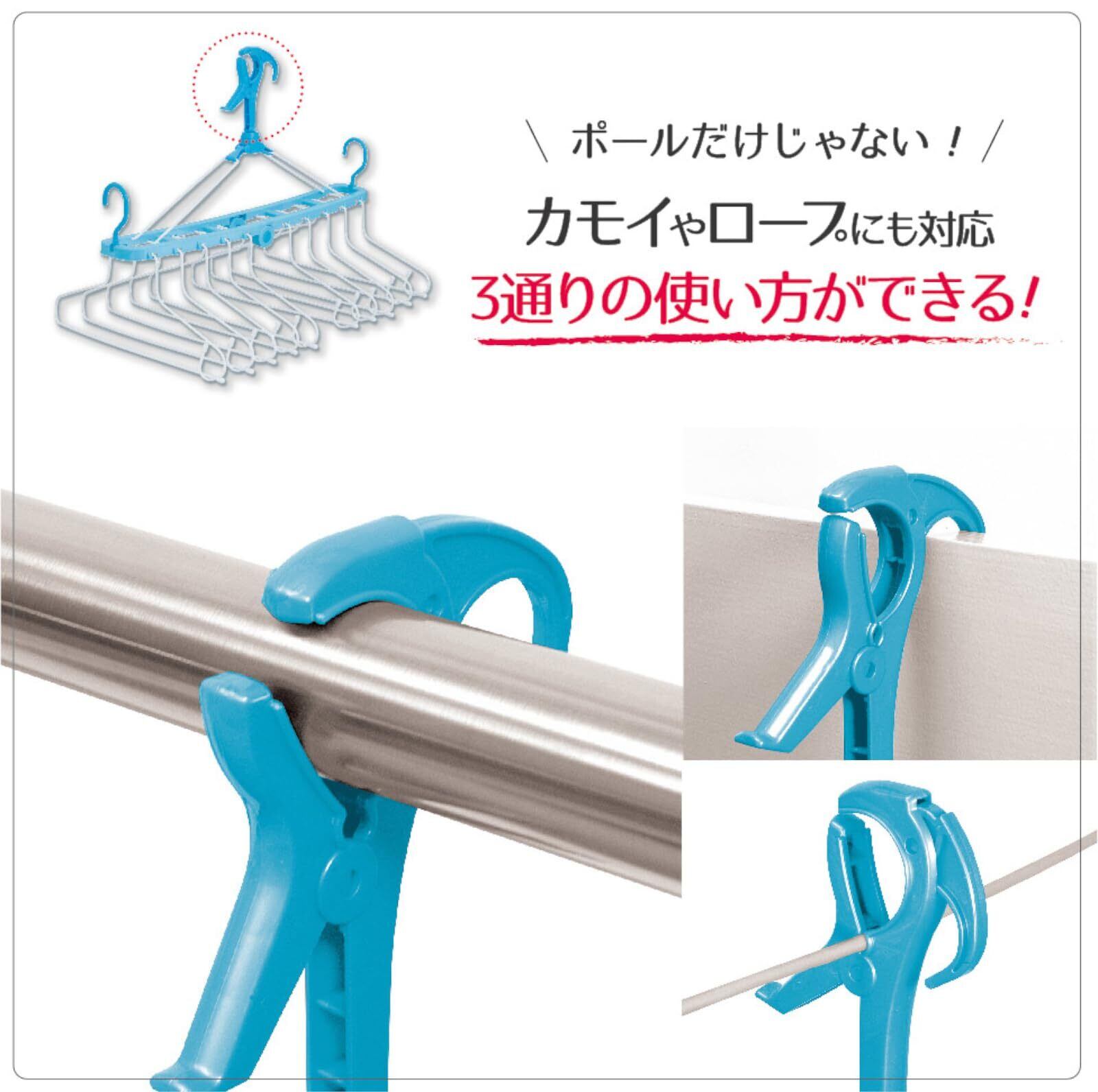 ●竿やロープにしっかりはさめるキャッチフック式です。また鴨居につけるフックもついてるので3ウェイフックです