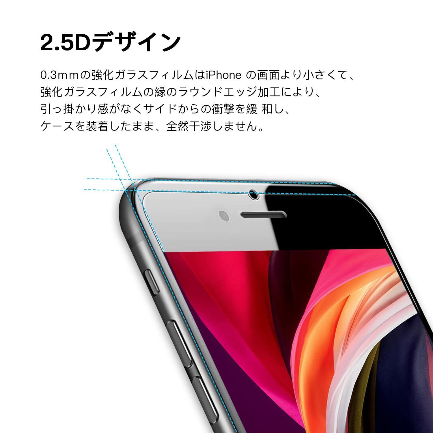 【2.5D処理】当製品は2.5Dラウンドエッジ処理でフィルムの角を丸く加工することで、装用時もスマホ角部分の違和感が無く高級感がアップ、 ケースと干渉しなく、相性が良いものです。