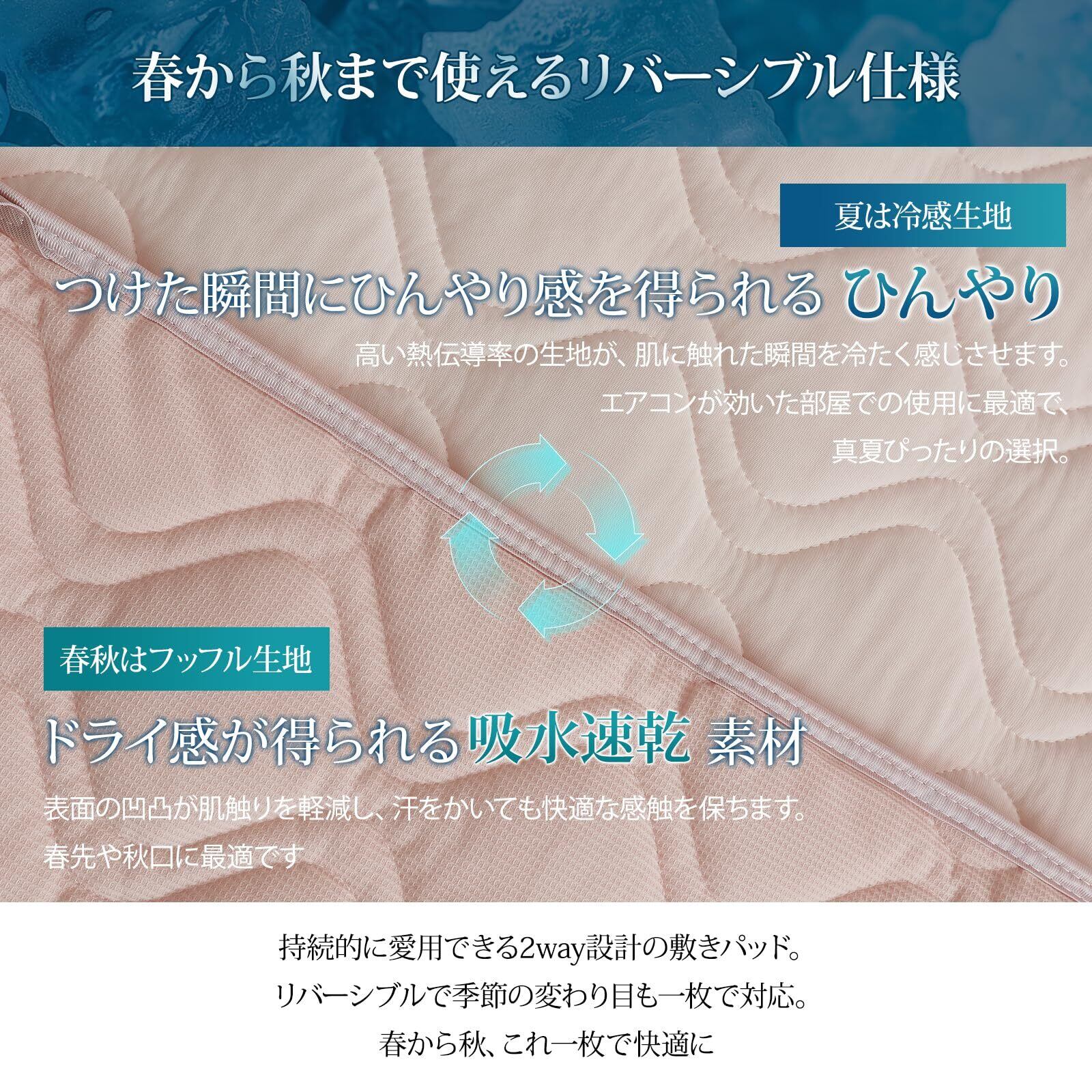 【リバーシブル仕様でロングシーズン快適】蒸し暑い時期に、ひんやり冷たい接触冷感面を使い、滑やかでサラッとひんやり肌触り、汗ばむ季節にぴったり。裏面はサラッと気持ちの良いワッフル生地、通気性、吸水速乾性にすぐれ、少し肌寒い時期に最適。リバーシブルで春~夏~秋まで快適に使える嬉しい一枚。