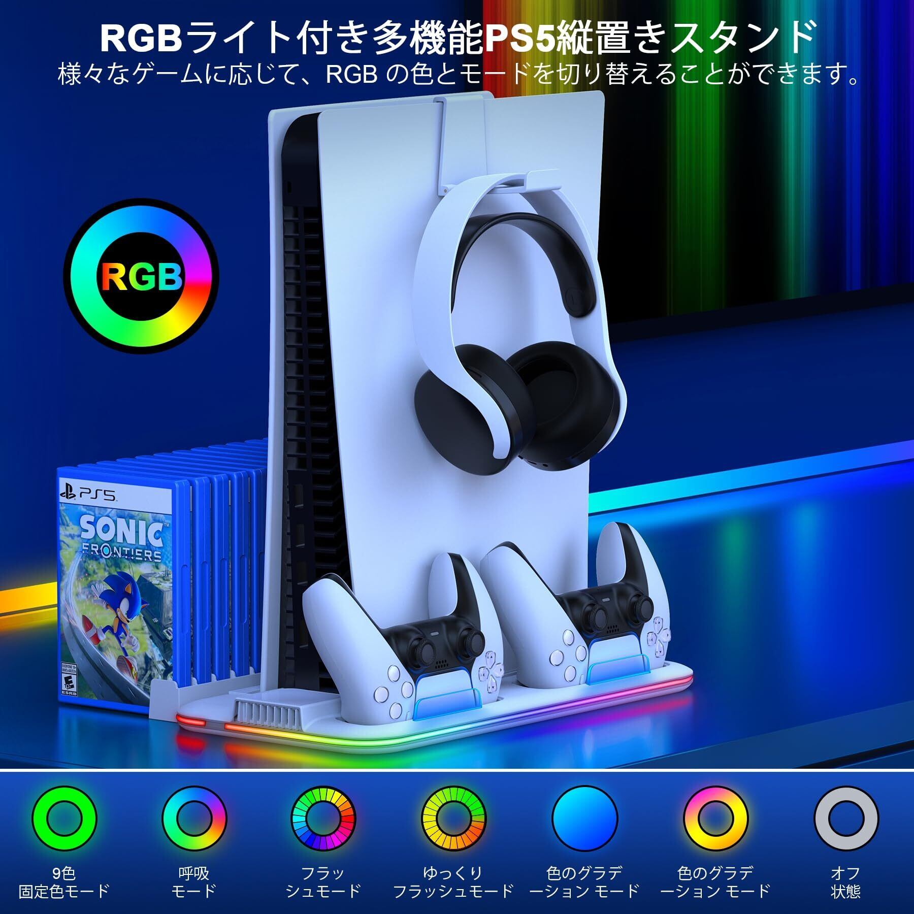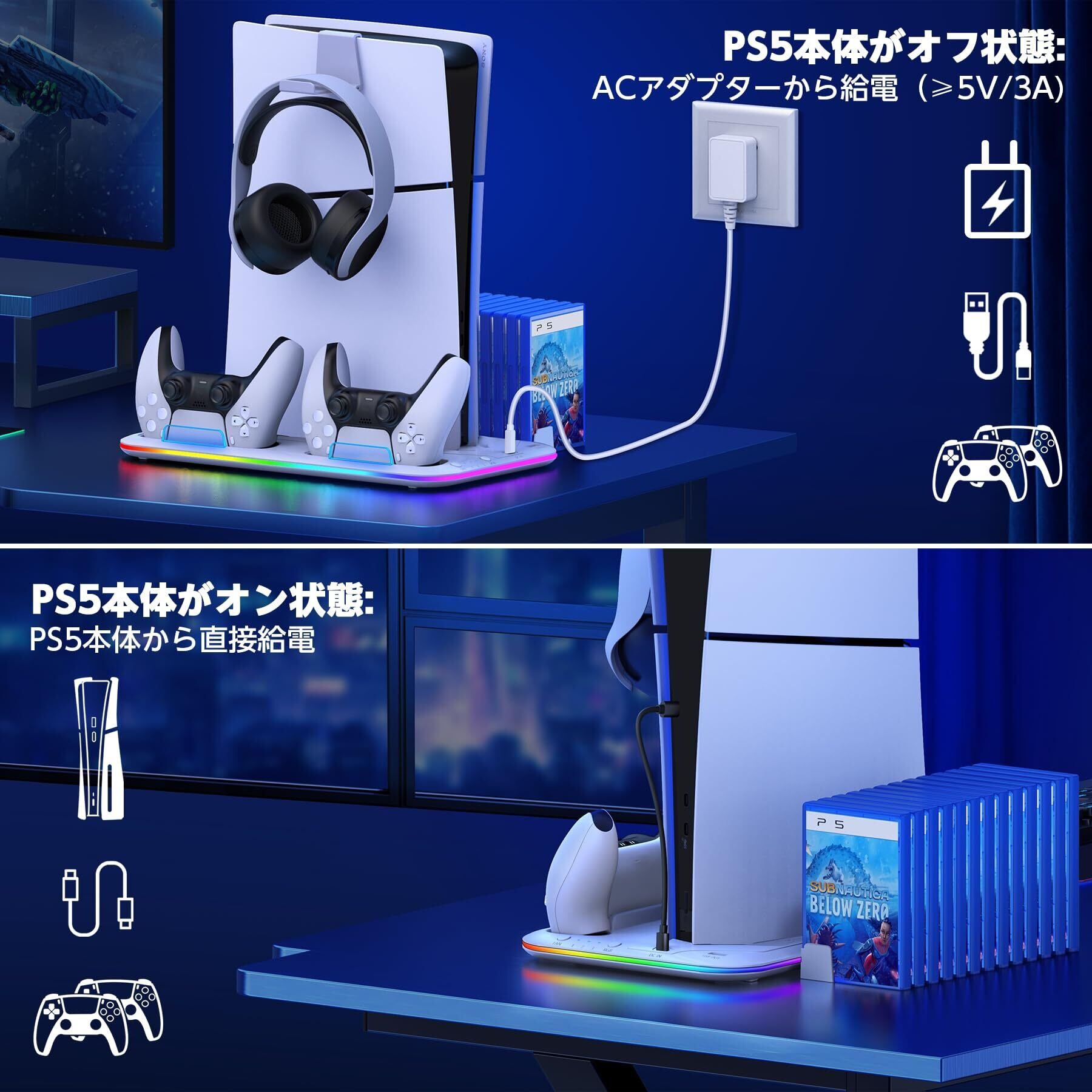 PS5 Slim スタンド PS5 Silm/PS5 縦置き スタンド PS5/PS5 Silm コントローラー 充電スタンド 2台同時充電 新型ps5 3段階冷却 PS5ディスク-デジタル兼用 冷却ファン 充電指示ランプ付 収納 多機能 ネジ付 USBケーブル付 RGBライト ホワイト