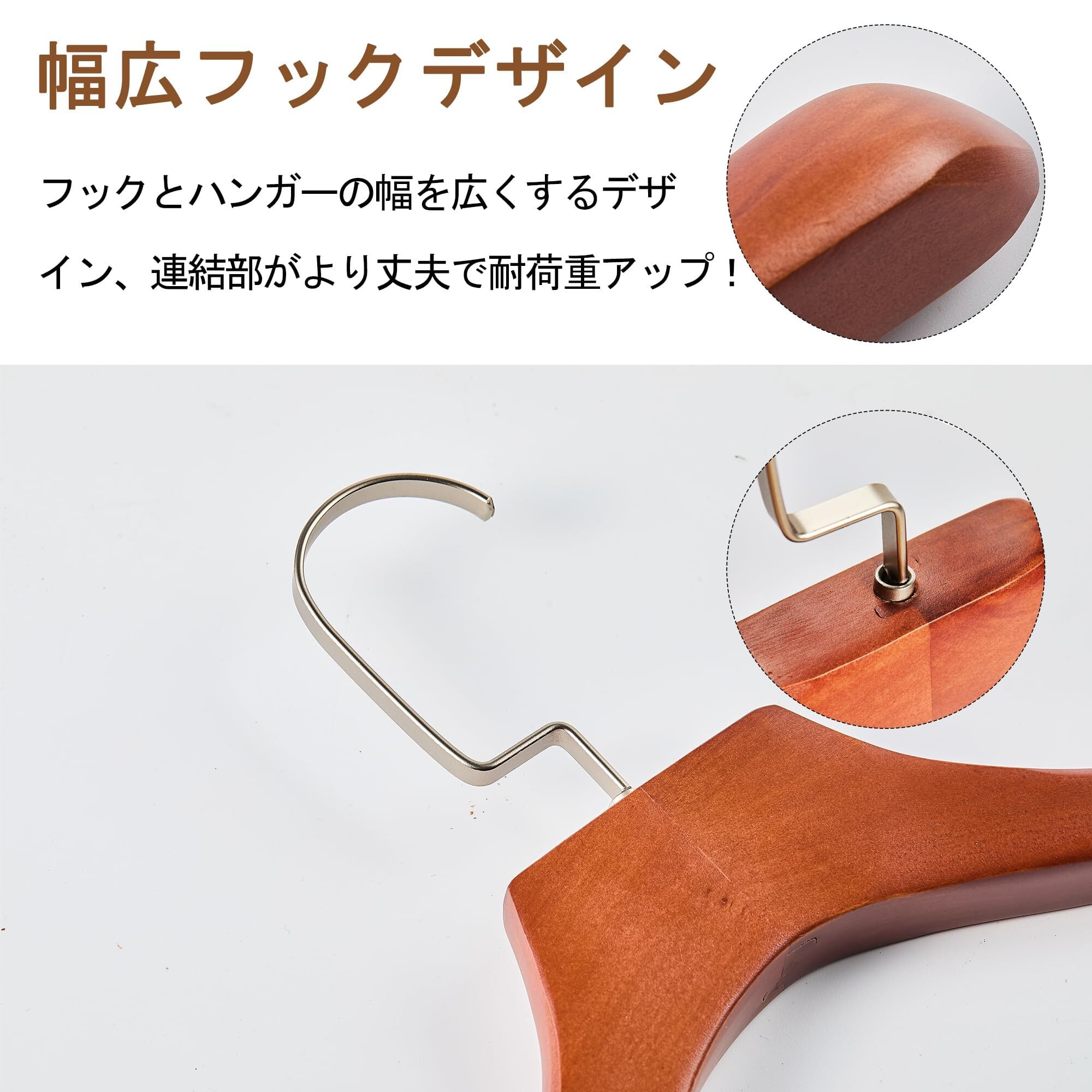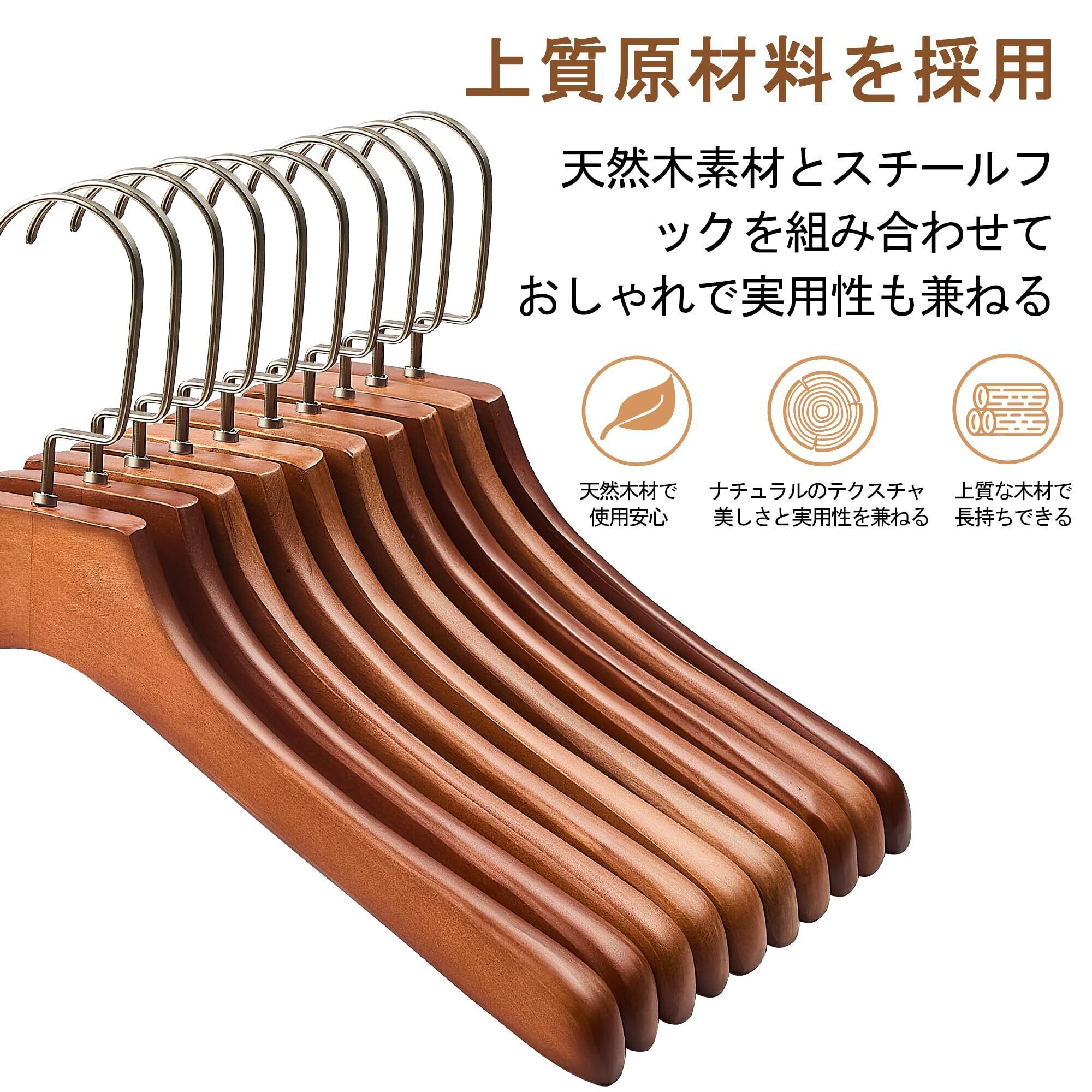 【360°回転フック、サビ防止】木製ハンガーのフック部分は360°回転するので、角度を自由に調整できます。アイロンをかける際には、ハンガーから衣服を取り外す手間なく回転させることができますので、優れた便利性を持ち合わせています。さらに、このハンガーのフックはクロームメッキで錆びにくいです。