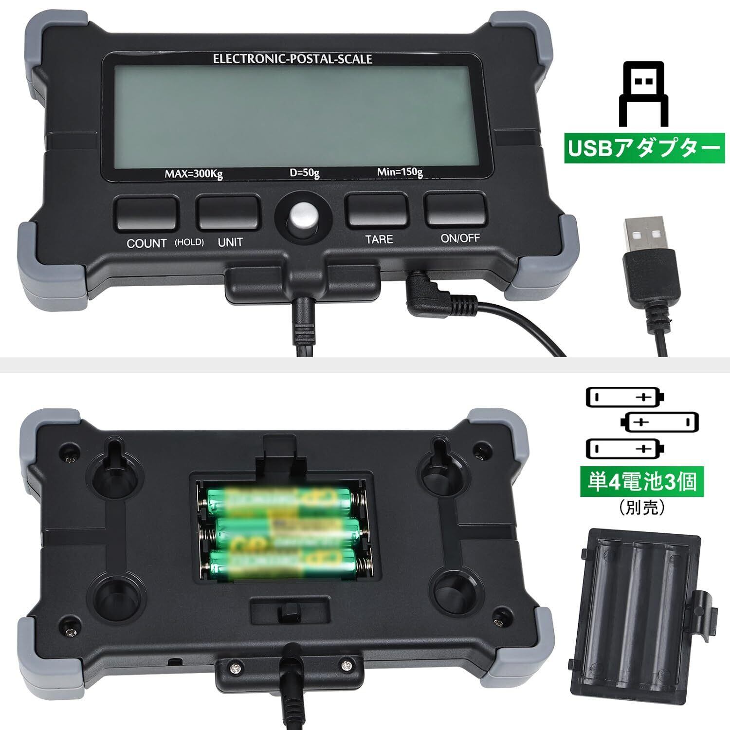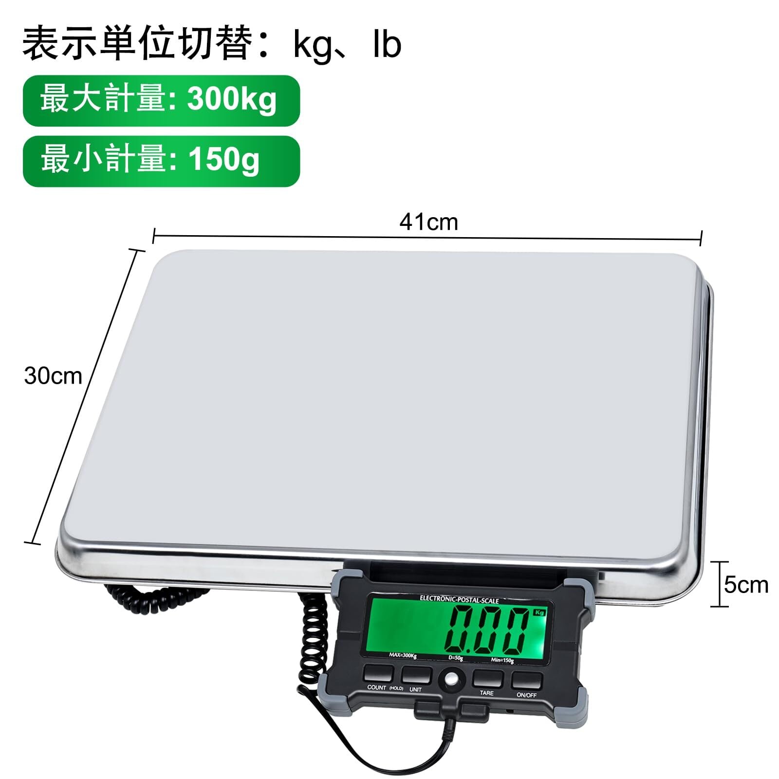 計量範囲:0.15kg - 300kg、精度:0.05kg(この電子秤の精度値が50g単位なので、計量精度のために50g以上の物を計量してください)。