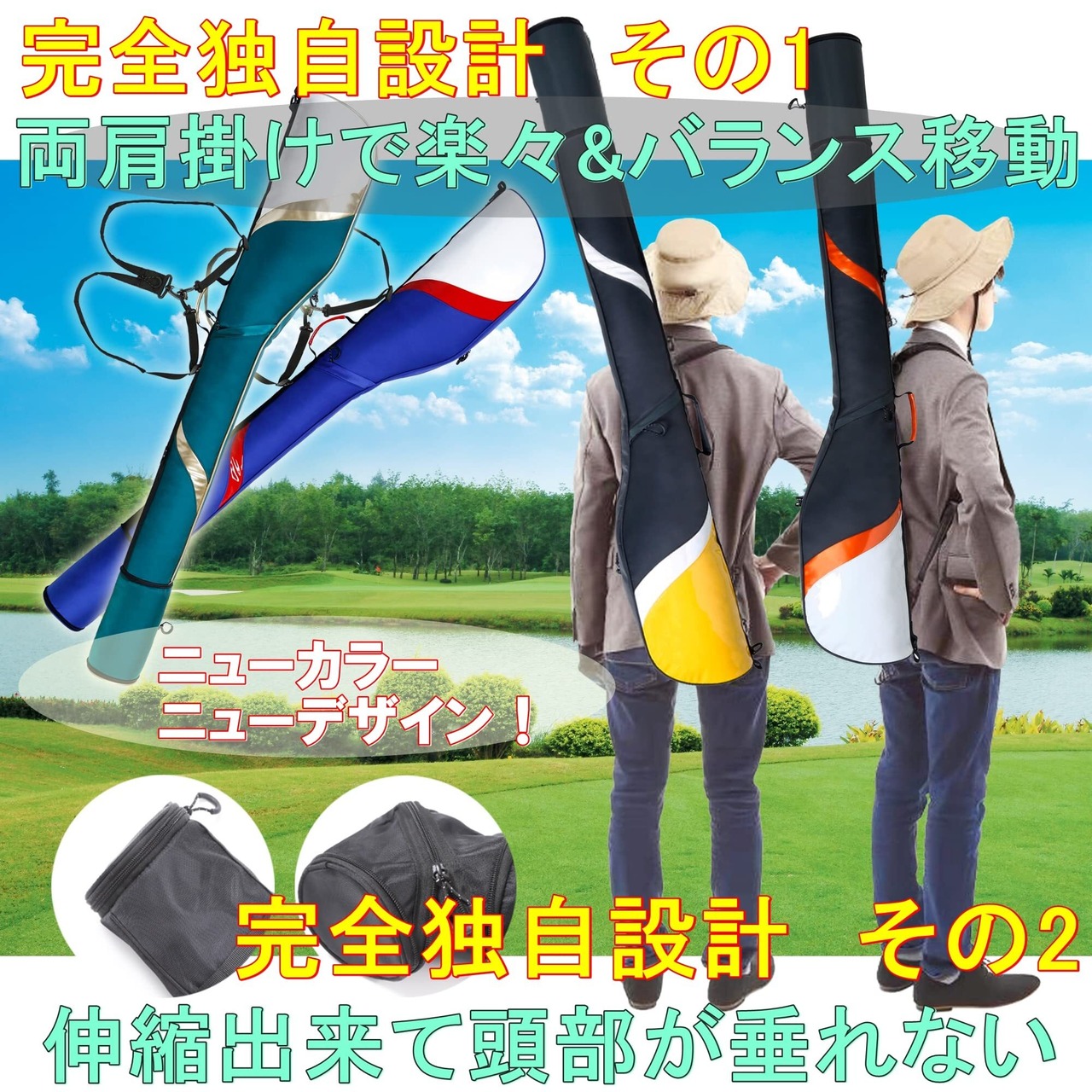 ソフトゴルフクラブケースにこれまで無かった2つの機能を新提案! 完全独自設計ゴルファーの為の2つの特徴。 一つは本体最下部のチャックを使って長さが2段階に変わることです。(伸ばして48インチドライバー収納可) もう1つが身体にピッタリ両肩で背負える事です。