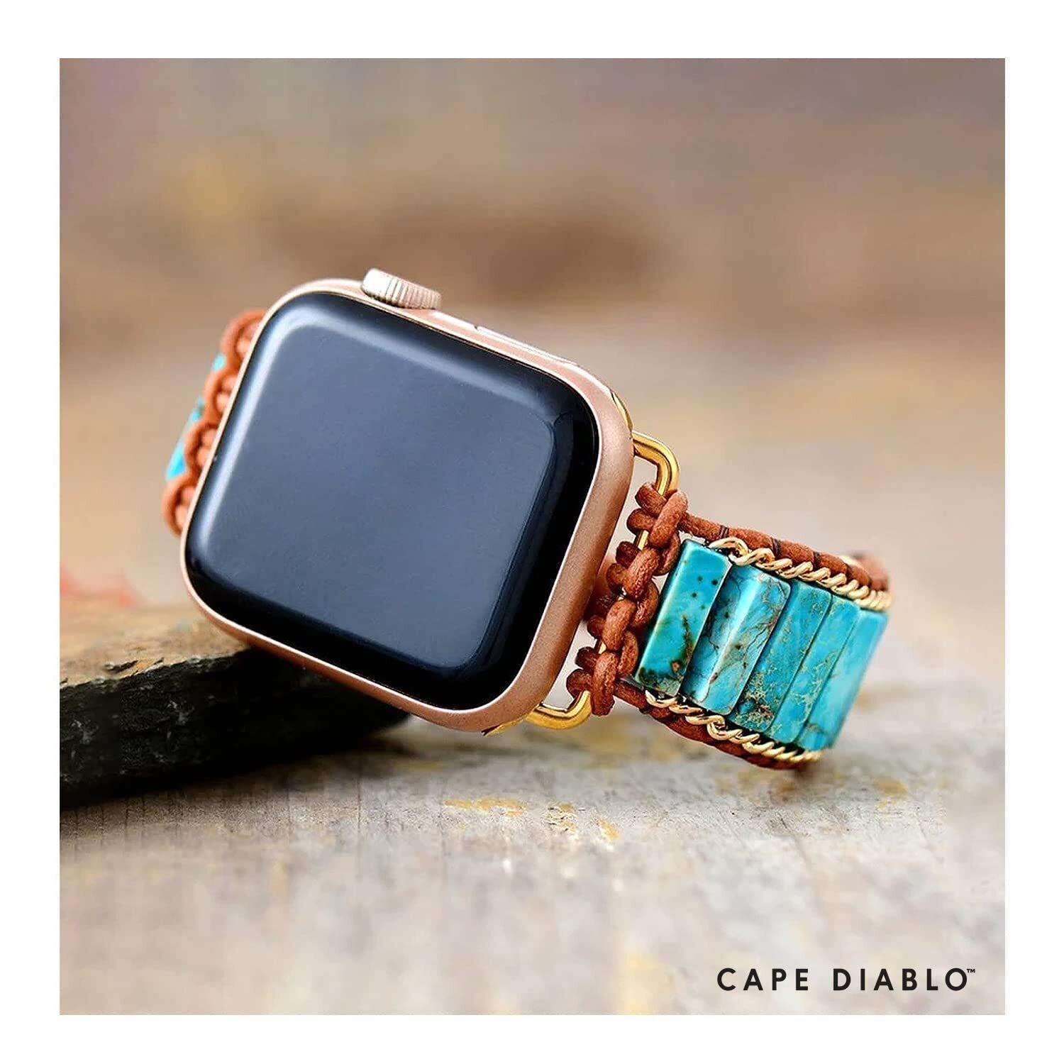 cape diabloの「ネイティブターコイズ」は、厳選されたターコイズ(トルコ石)をハンドメイドで丁寧に編み上げた、ブレスレットのようなApple Watchバンドです。ポジティブな意味合いのパワーストーンアイテムとして、贈り物にも最適です。
