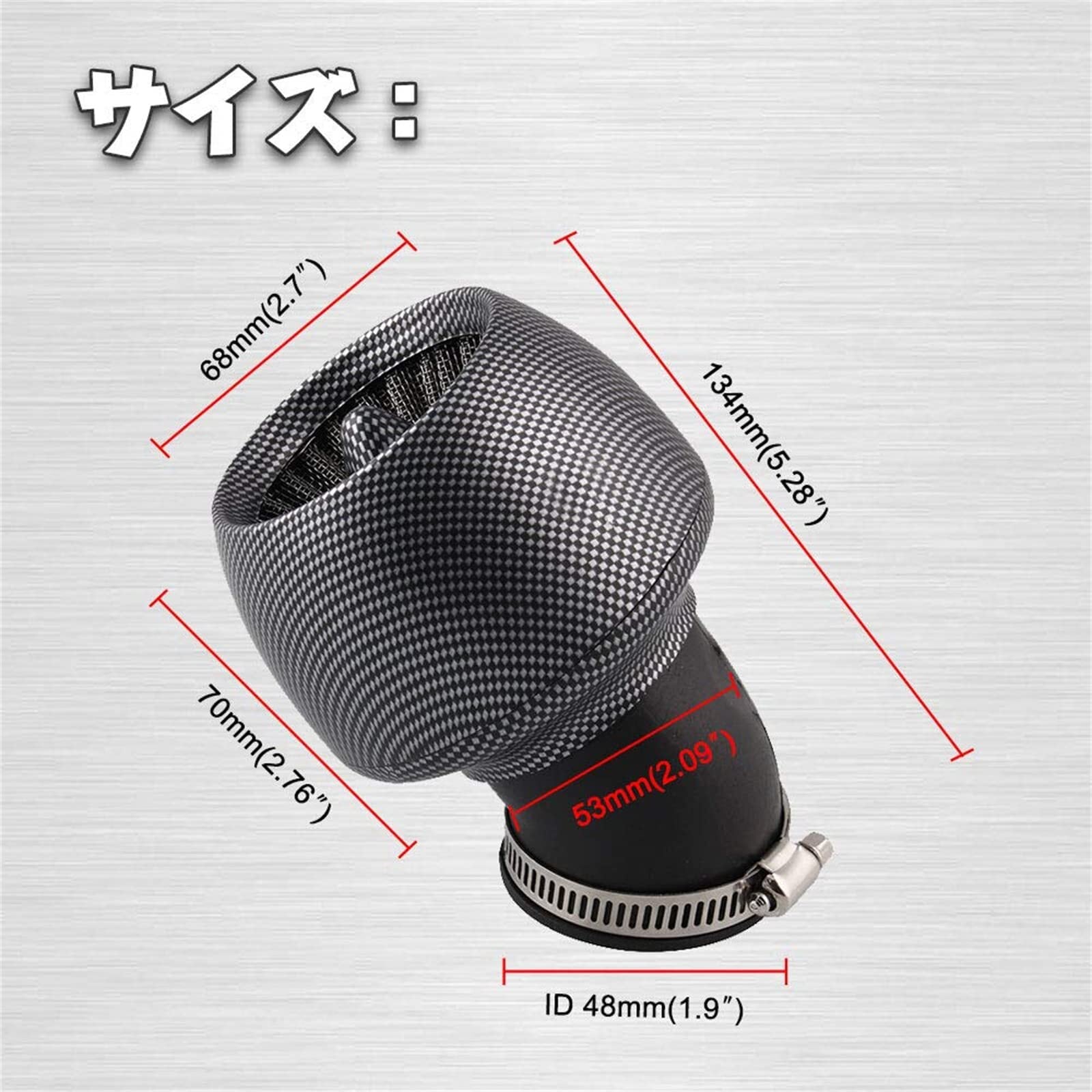 【取付簡単】- 45の角度のついたネックデザイン、しっかりとしたフィッティングエリアの接続できます。便利な取り付けのために調整可能なホースクランプが付属します。 ご注意:ご購入の前にバイクのキャブレターの口径サイズまた固定用金具の取り付けスペースとフィルター部分のスペースが確保出来るかご確認下さい。