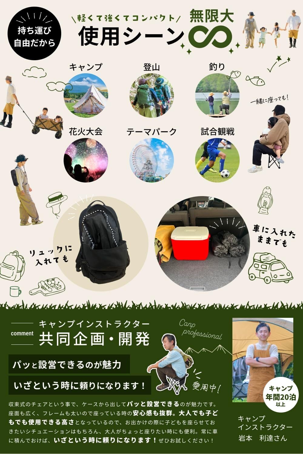 【超コンパクト使用シーン無限大】イス脚部の特殊ヒンジにより、使用後はコンパクトに折畳が可能です。また、専用のオックスフォード生地の収納袋にしまうことで、どこへでもすぐに持ち運びが可能です。キャンプ・BBQ・釣り・花火大会・テーマパーク待ち時間・大阪万博・ピクニック・花見・子供の試合観戦など様々なシーンでご使用いただけ、車に一台置いておけばどこでも安心なアウトドアアイテムです。