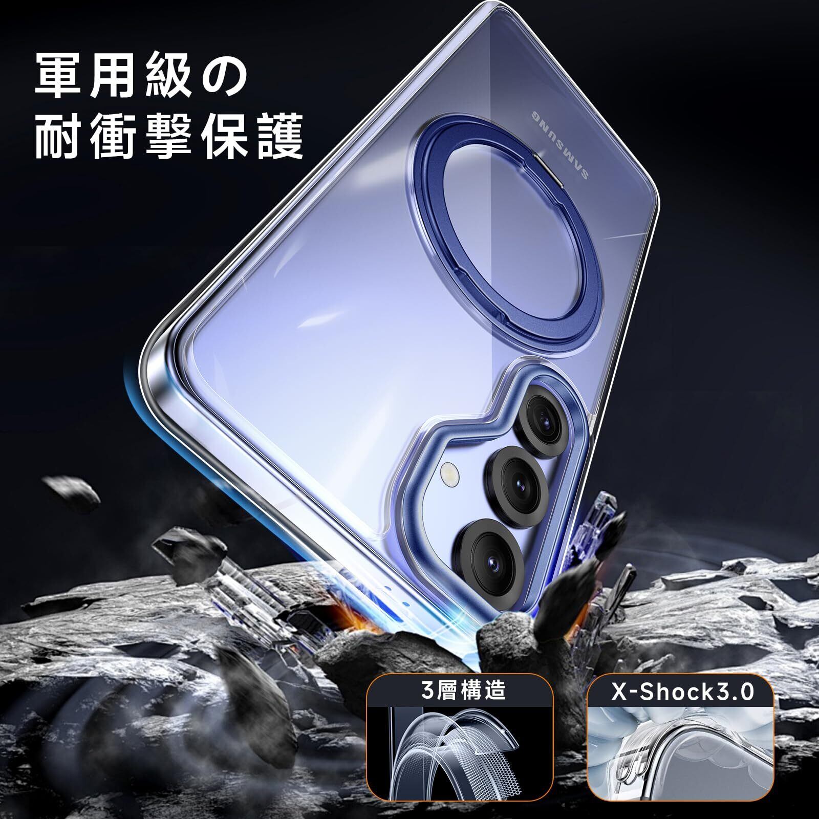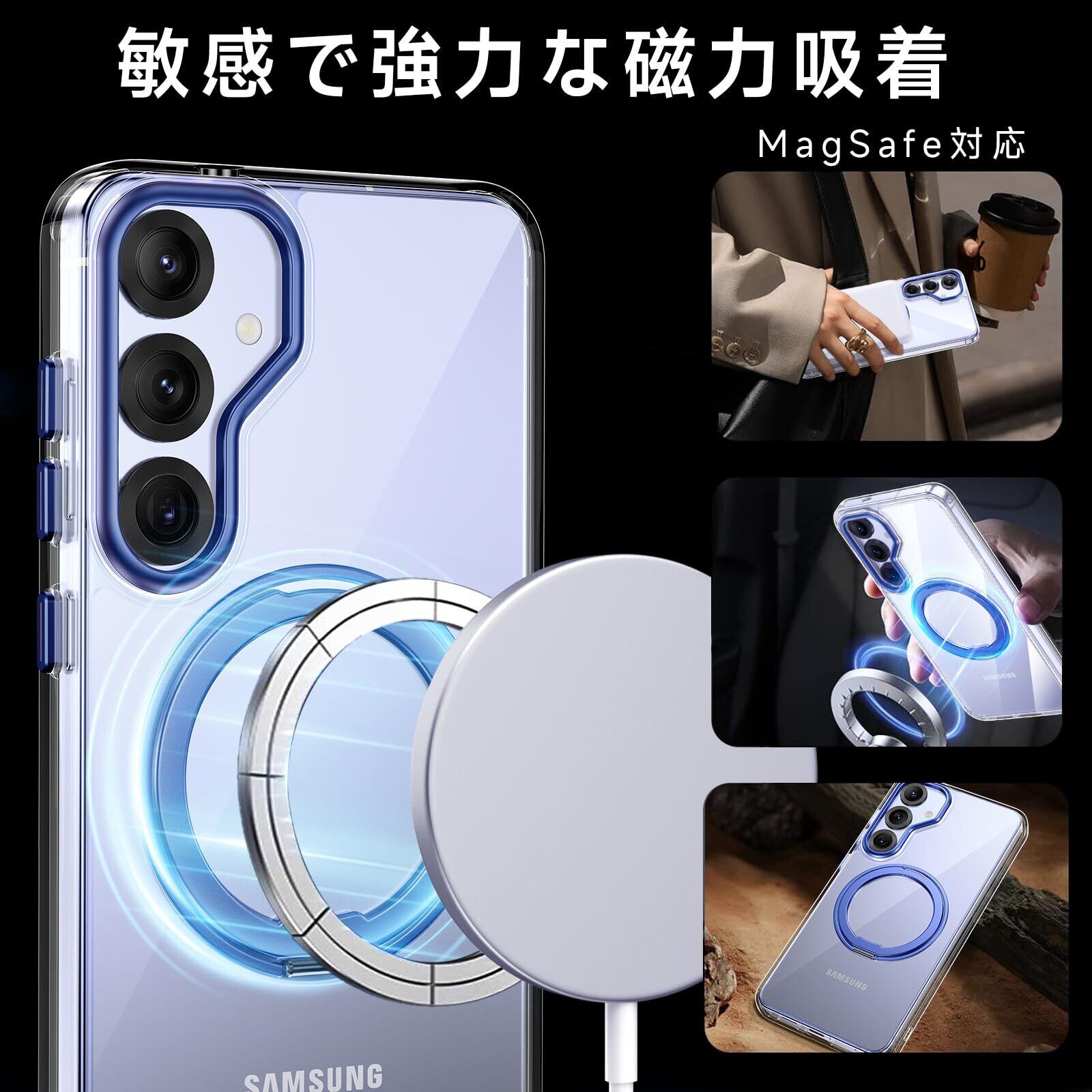 【米軍MIL規格・Magsafe対応】Galaxy S25 用 ケース MagSafe対応 リング 360°回転スタンド機能 縦横両対応 透明 黄ばみ防止 ワイヤレス充電 レンズ保護 耐衝撃 携帯カバー ギャラクシー S25 カバー マグネット搭載 車載ホルダー マグセーフ対応 おしゃれ (クリアブルー)