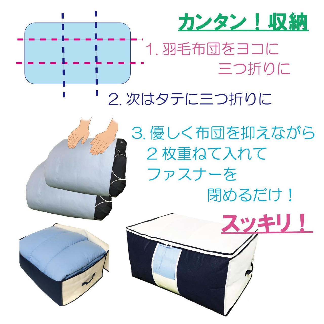 【羽毛布団を2枚まとめてスッキリ】押し入れなどでかさばる羽毛布団を軽く抑えて空気を抜きながら収納!最後はファスナーを閉めてスッキリ/カンタン収納!