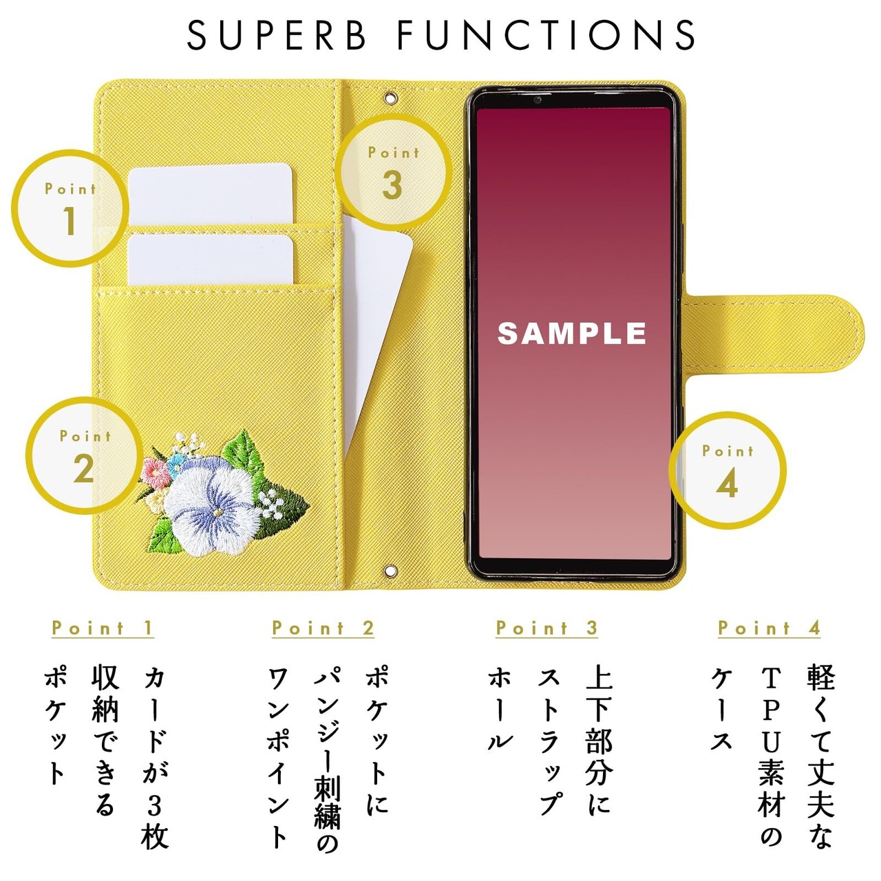 内側にはカードなどが収納できるポケット付きの、実用的なハンドあり手帳型ケースです。高級感のあるサフィアーノ調生地に華やかで上品なオリジナルデザインのパンジー刺繍を施しています。ストラップ穴付きのため、チェーンを付けたりストラップを付けることが可能となります。