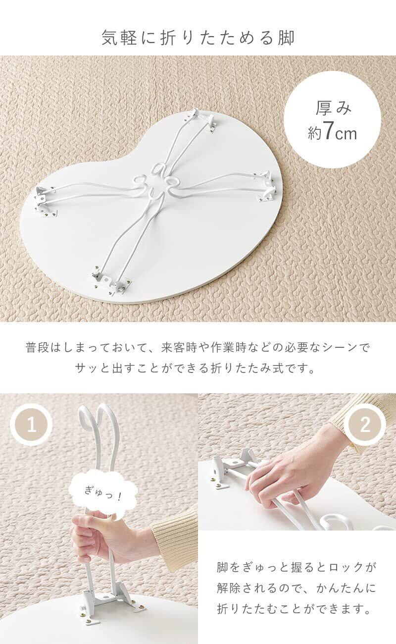 折りたたみ脚のビーンズ型テーブル。 丸形や楕円型とも違うオシャレなデザインの天板がポイント。 真っ白なホワイトカラーと猫脚が甘さを足してくれます。