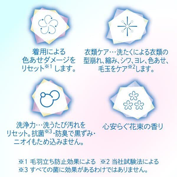 成 分 : 界面活性剤 (25% ポリオキシアルキレンアルキルエーテル)、安定化剤、色落ち防止剤、酵素(毛羽立ち防止成分)、抗菌剤