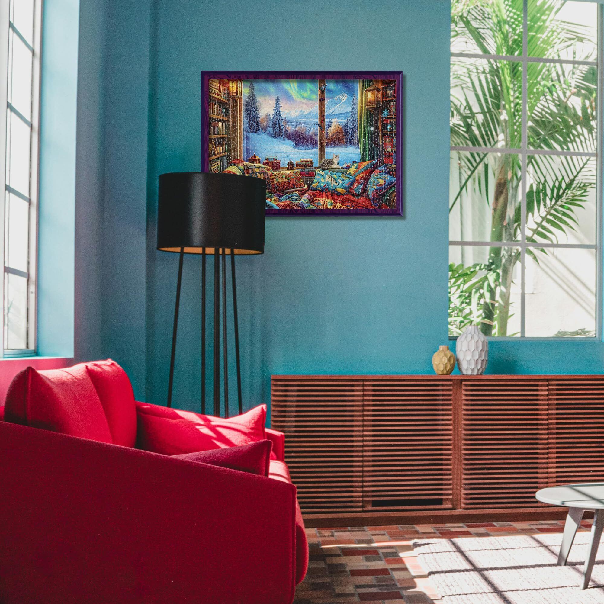【暖かい部屋】雪景色が見える暖かい部屋を描かれだジグソーパズル。暖かい部屋を探索しながらパズルを楽しむことができます。