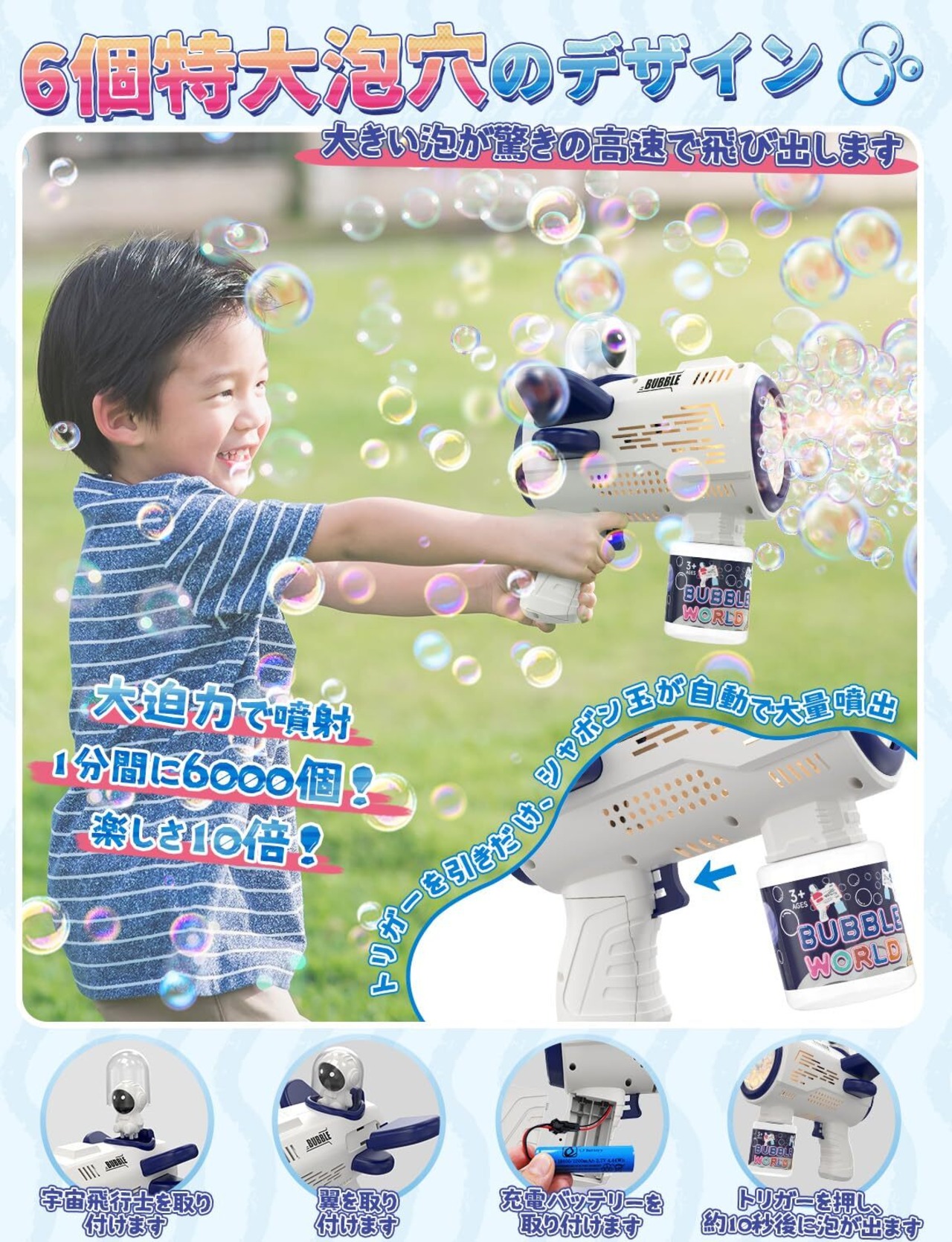 【新バージョン!6個特大泡穴のデザイン】この新バージョンの電動バブルガンは、6つの特大泡穴を備えており、大迫力で泡を噴射します。その驚きの高速噴射により、子供たちはワクワク感を味わいます。さらに、1分間に6000個もの泡を生成する能力を持っています。これにより、楽しさは通常の10倍にもなります!子供たちは大量の泡に囲まれて、喜びと興奮を感じることでしょう。