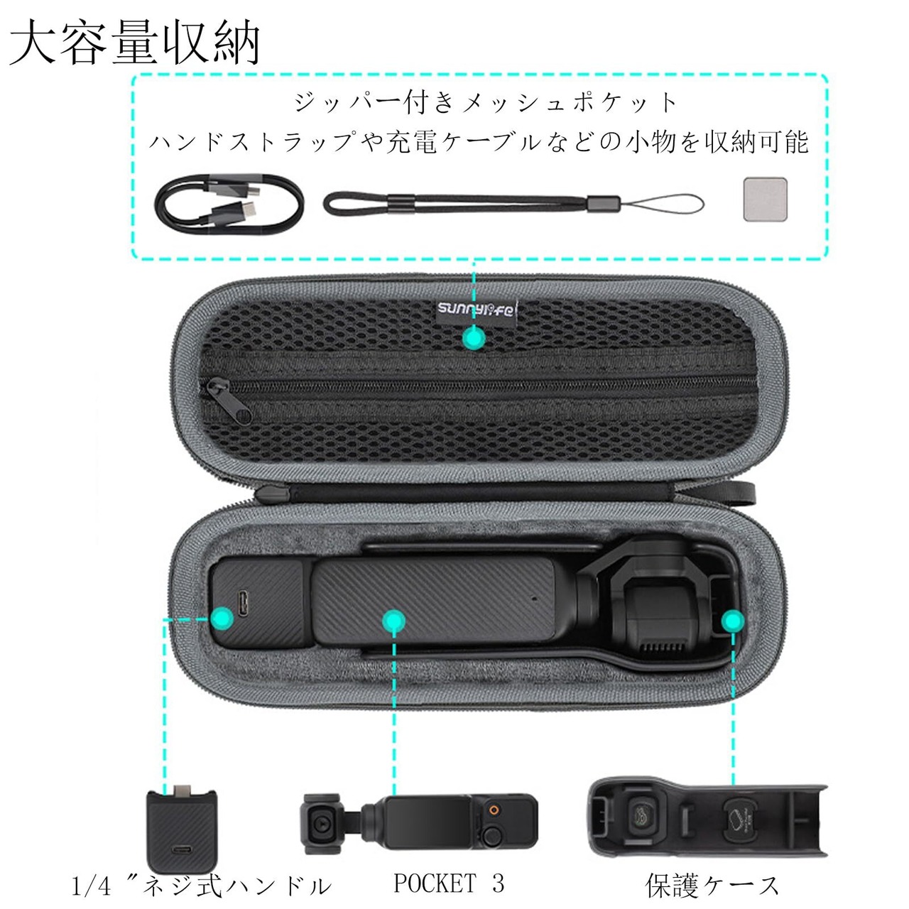 【大容量】dji osmo pocket 3 ケースはPOCKET 3、保護ケース、1/4インチネジ付きハンドルを収納でき、内側にはハンドストラップ、充電ケーブル、その他の小さなアクセサリーを収納できるジッパーメッシュストラップが付いています。