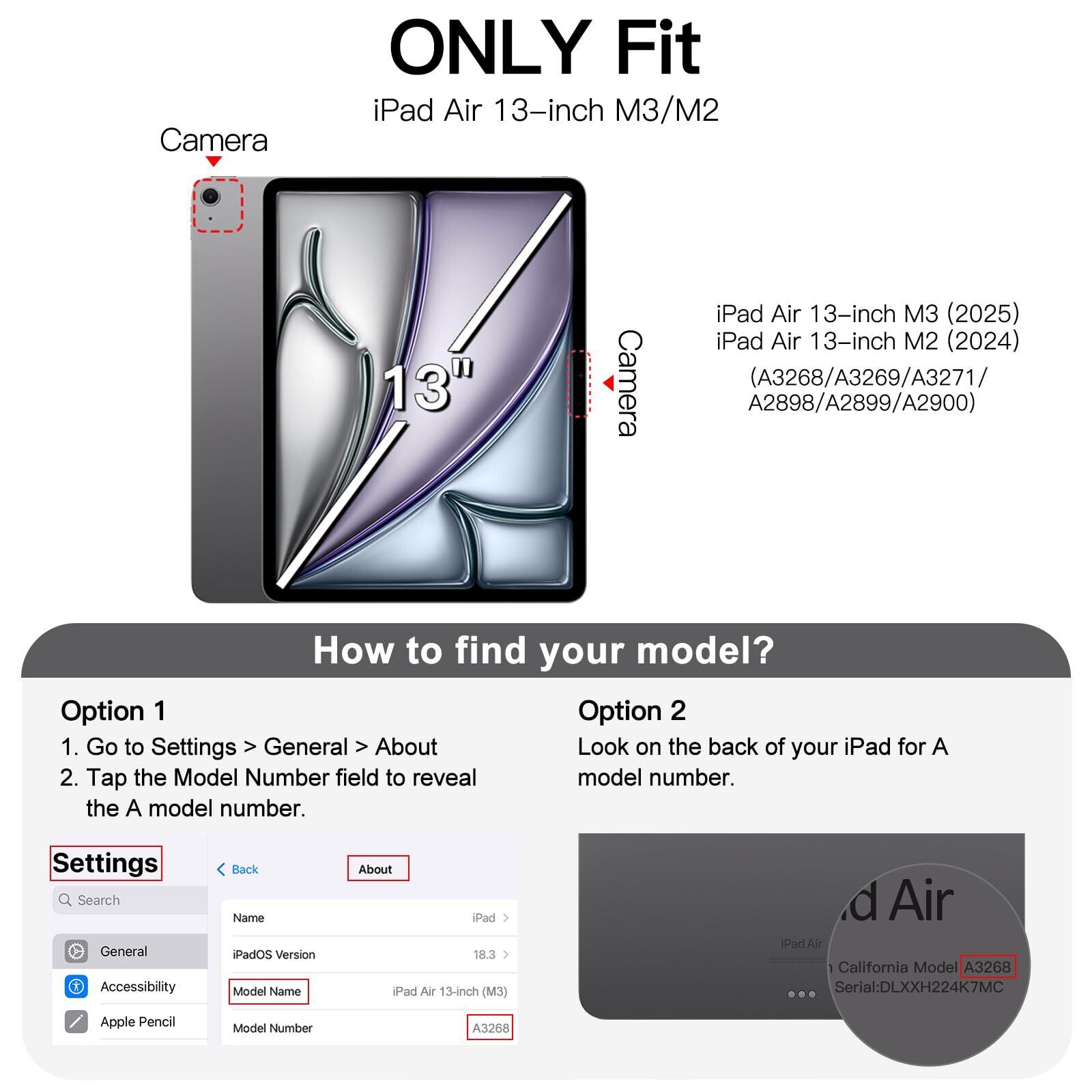 [互換性] Pencil Pro/Pencil(USB-C)に対応。iPad Air 13インチM3/M2(2025/2024)用の特別デザインです。対応iPadモデル番号:A3268 / A3269 / A3271 / A2898 / A2899 / A2900。「設定」>「一般」>「情報」の順に選択します、「モデル番号」フィールドをタップしてAモデル番号を表示します