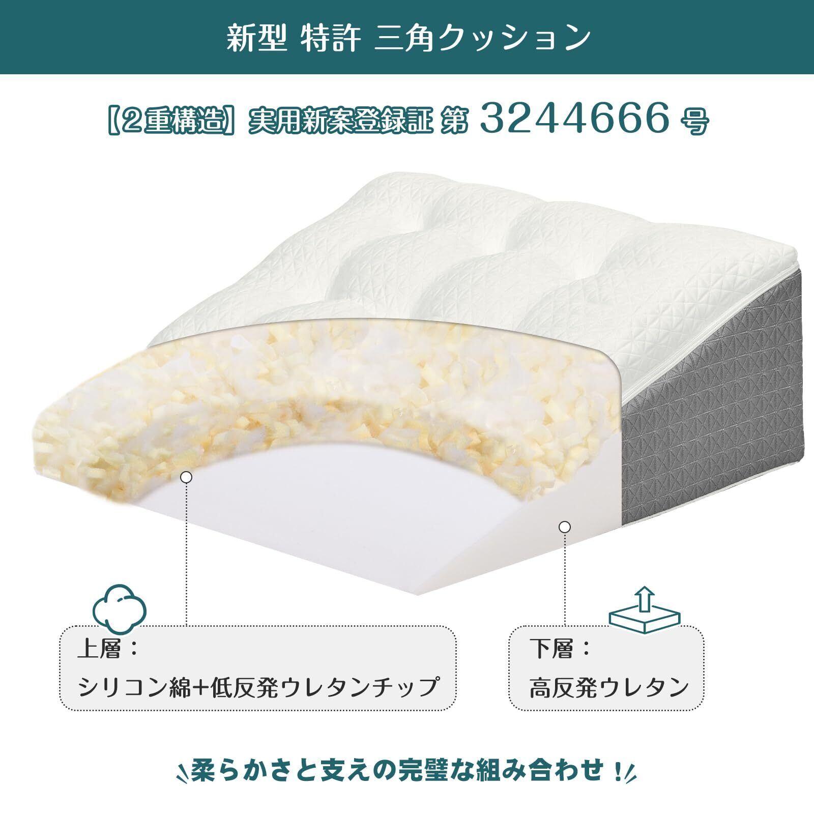 【特許取得済み2重構造】この新型三角クッションは、特許取得済みの2層構造(実用新案登録証 第3244666号)を採用しています。上層にはシリコン綿と低反発ウレタンチップを使用し、下層には密度25Dの高反発ウレタンを使用しています。この組み合わせにより、柔らかさと支えを完璧に両立させています。従来の三角枕はウレタンのみで作られており、サポート性は高いものの快適性に欠けていました。しかし、この新開発の三角クッションは、柔軟性とサポート性を兼ね備えており、最高の寝体験を提供します。