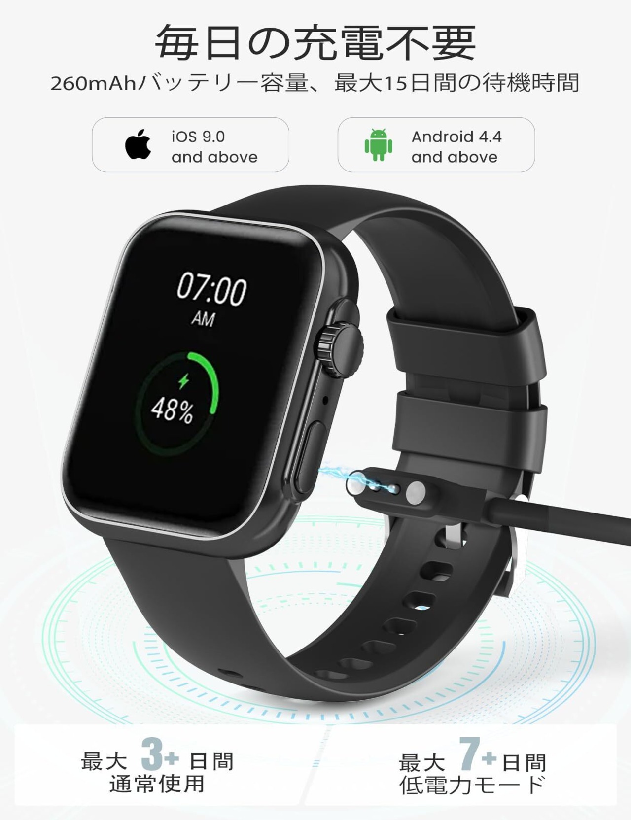 長時間バッテリー・生活防水・実用機能:260mAhのバッテリーを搭載し、通常使用で3〜5日間持続が可能で、電話やメッセージが少ない場合は最大14日間の連続使用が可能です。IP67等級の防水性能を備え、日常生活での手洗いや洗顔、運動時にも安心して使用できます(※水泳やサウナでの使用は避けてください)。さらに、スマホ探し、遠隔撮影、アラーム、天気予報などの便利な機能が充実しており、あなたの日常生活をより便利にサポートします。