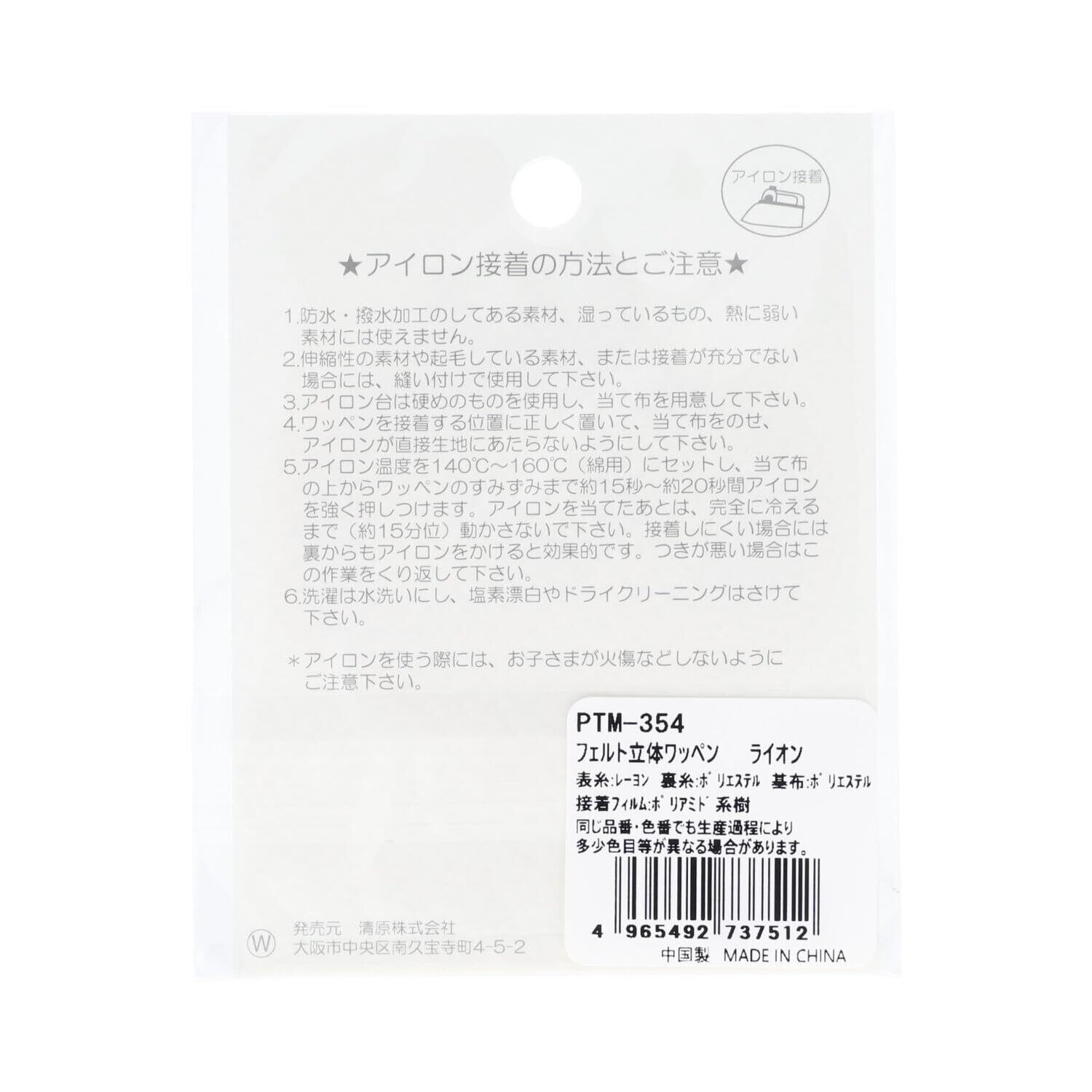 清原(KIYOHARA) プティデポーム フェルト 立体 ワッペン ライオン 約幅6.7cm×縦6.1cm 1枚入り アイロン接着 PTM-354