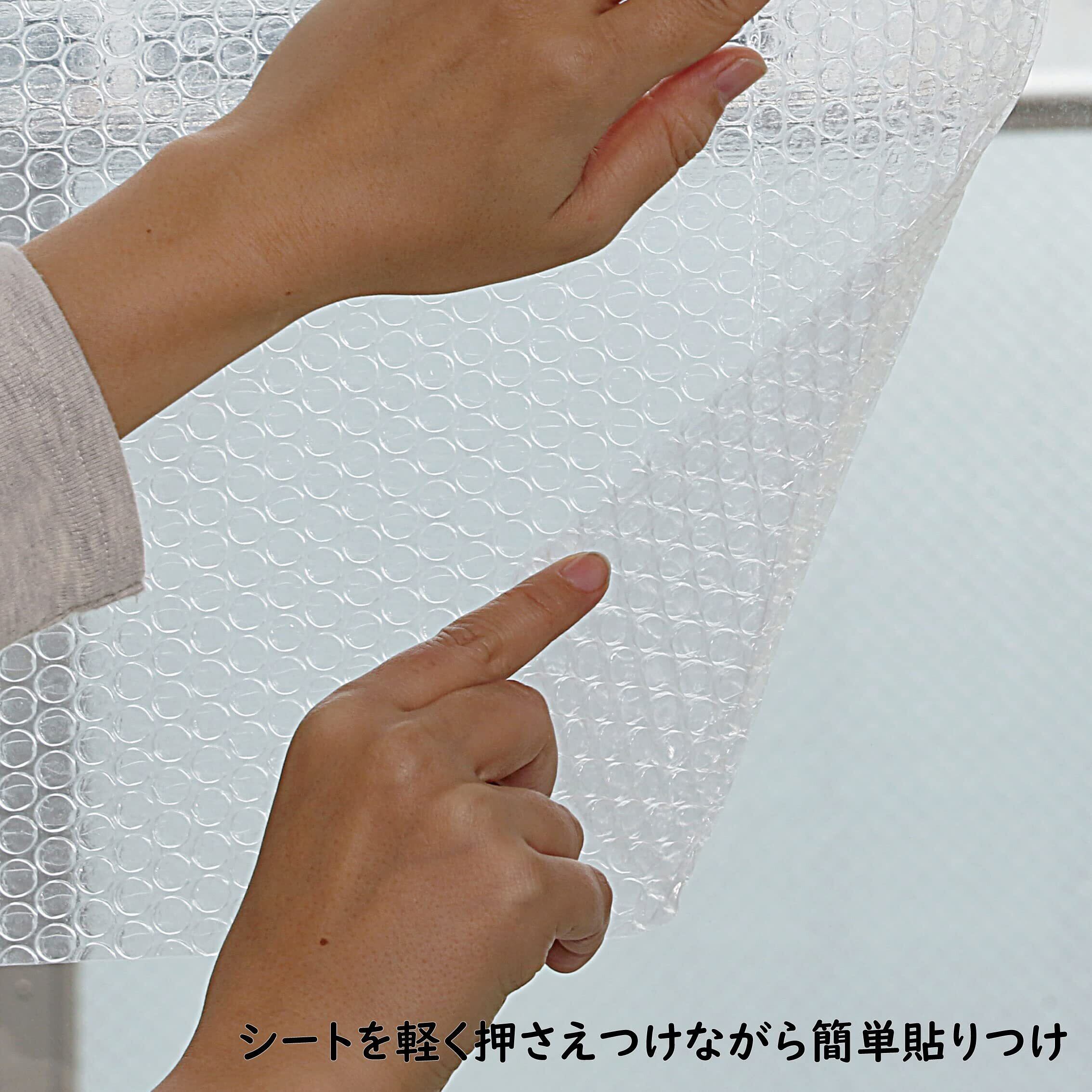 【空気の層を作ることで断熱効果を発揮】:プチプチをフィルムで挟んだ三層構造。窓とシートの間に空気層を作り断熱効果を発揮。