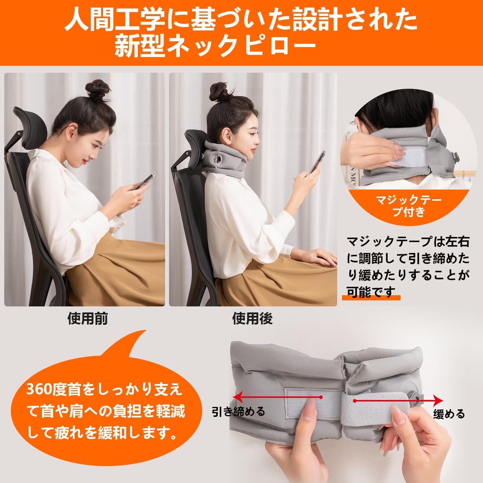 【エアー首枕&ネックサポート】長さ60cm幅15cmのサイズで人体工学デザインを利用して、エアー首枕を使って頭の揺れを抑え、首の痛みを緩和して支持性が良いです。個人の首まわりに合わせてエアー首枕のマジックテープの長さを自由に調節して360度全方位でネックサポートできて心地よい眠りを実現できるネックピローです。